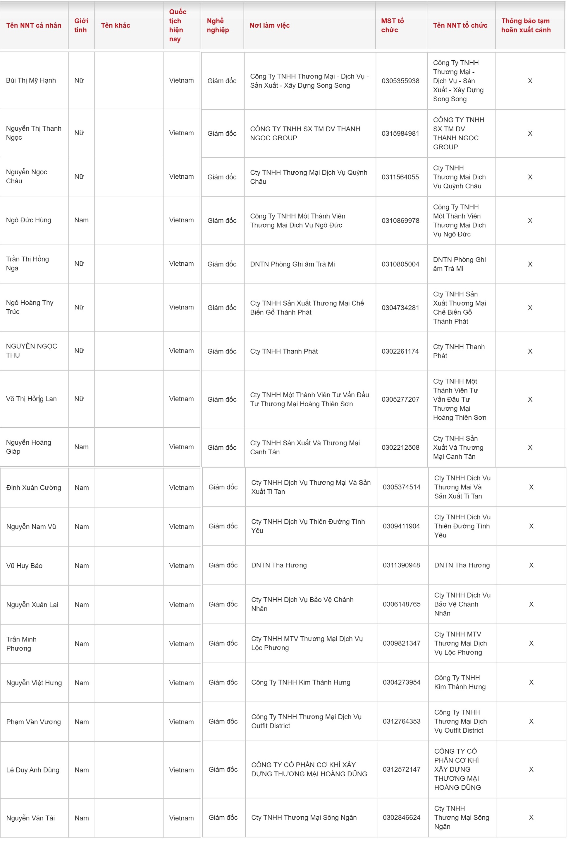 Danh sách người nộp thuế bị thông báo tạm hoãn xuất cảnh gồm:
