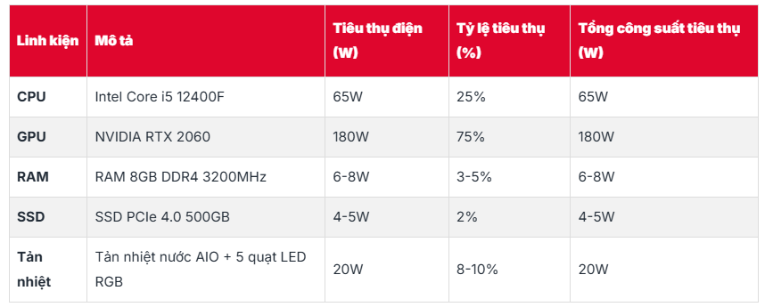 Mức tiêu thụ điện của các bộ phận, linh kiện trong hệ thống một dàn PC (mang tính chất tham khảo)