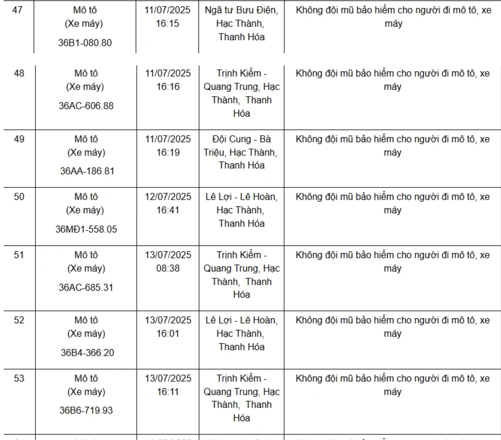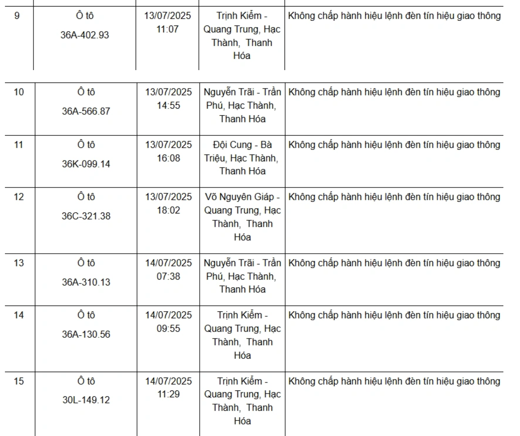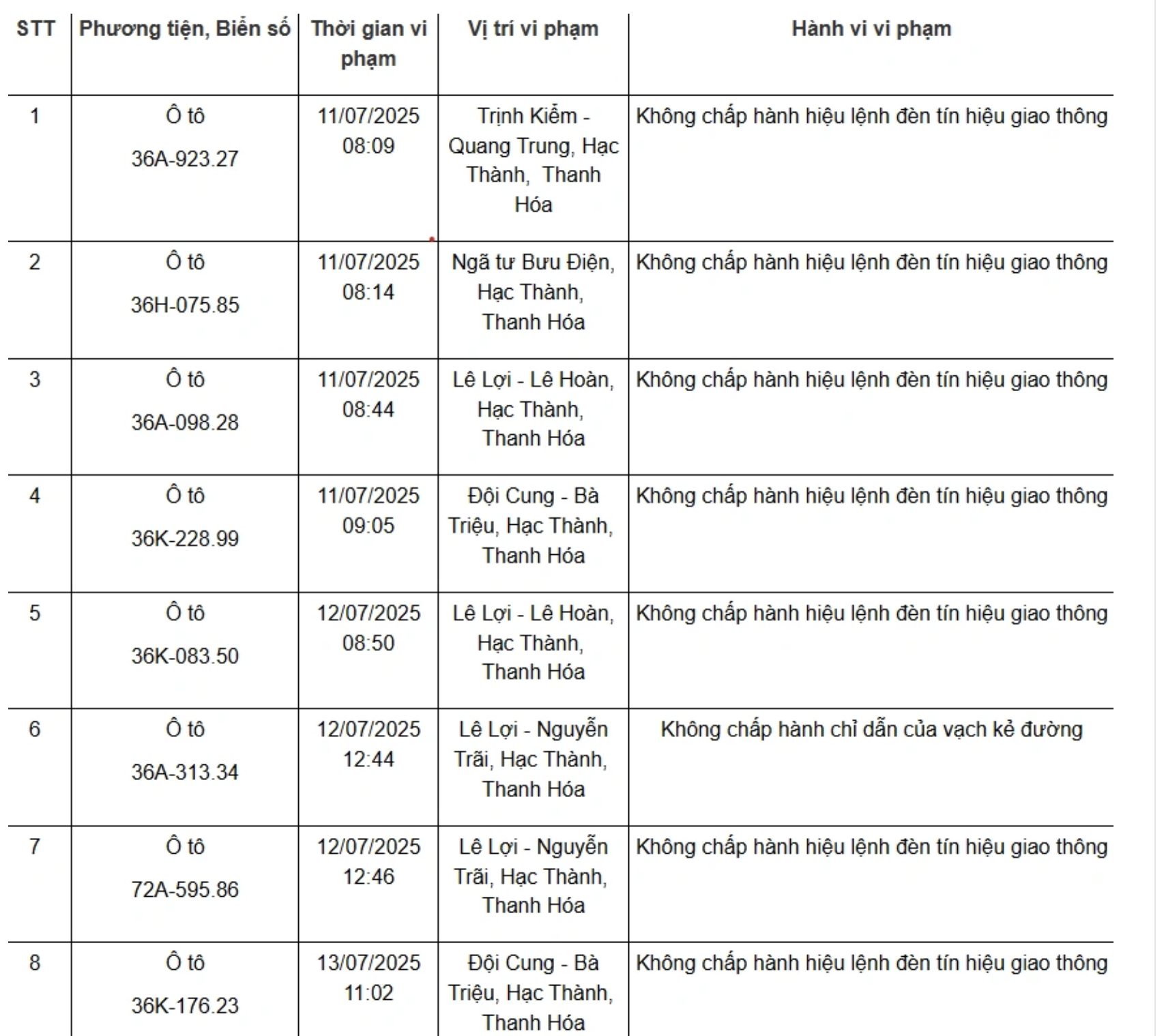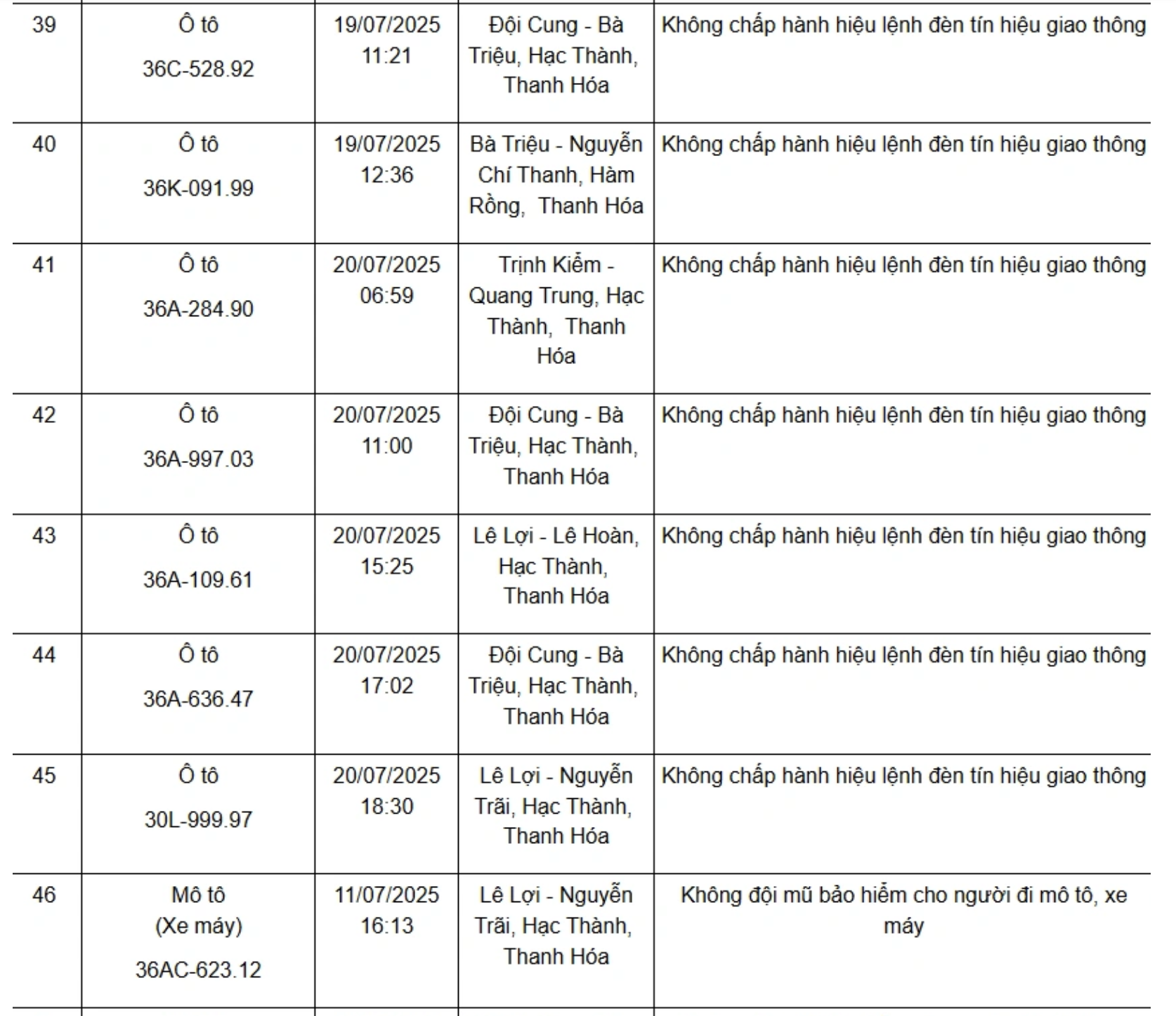 Dưới đây là danh sách 75 phương tiện bị xử phạt nguội từ ngày 11/7/2025 đến ngày 21/7/2025: