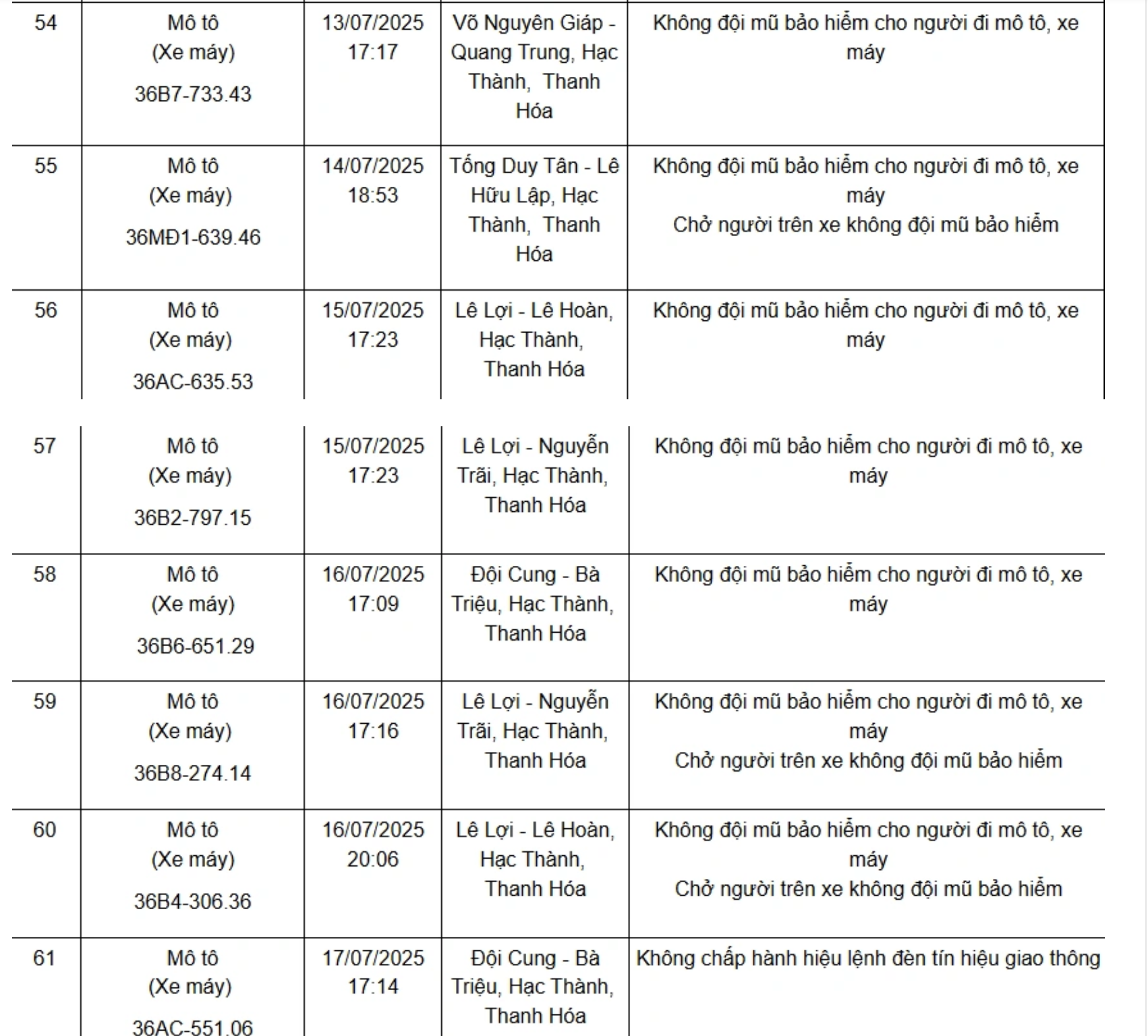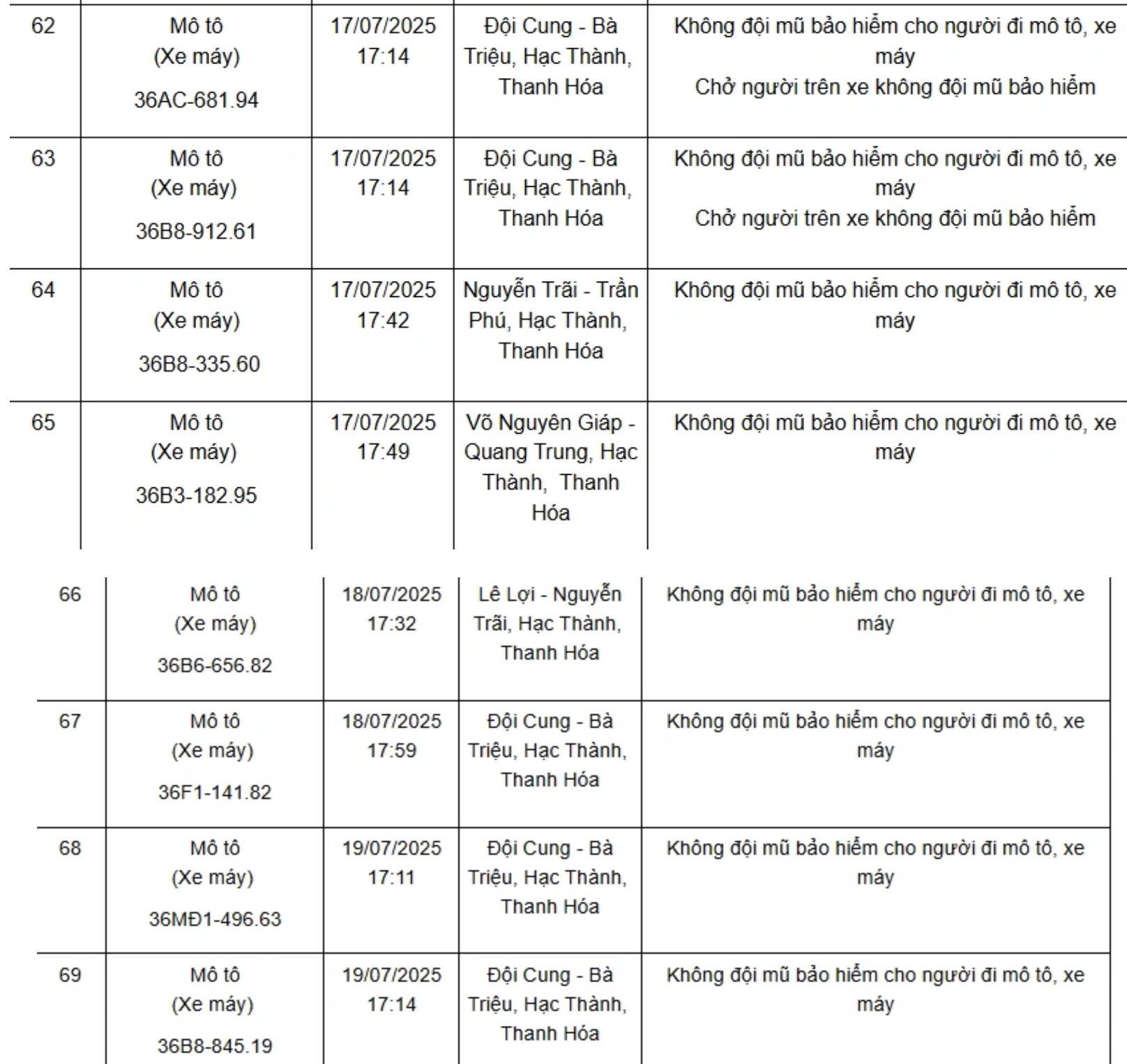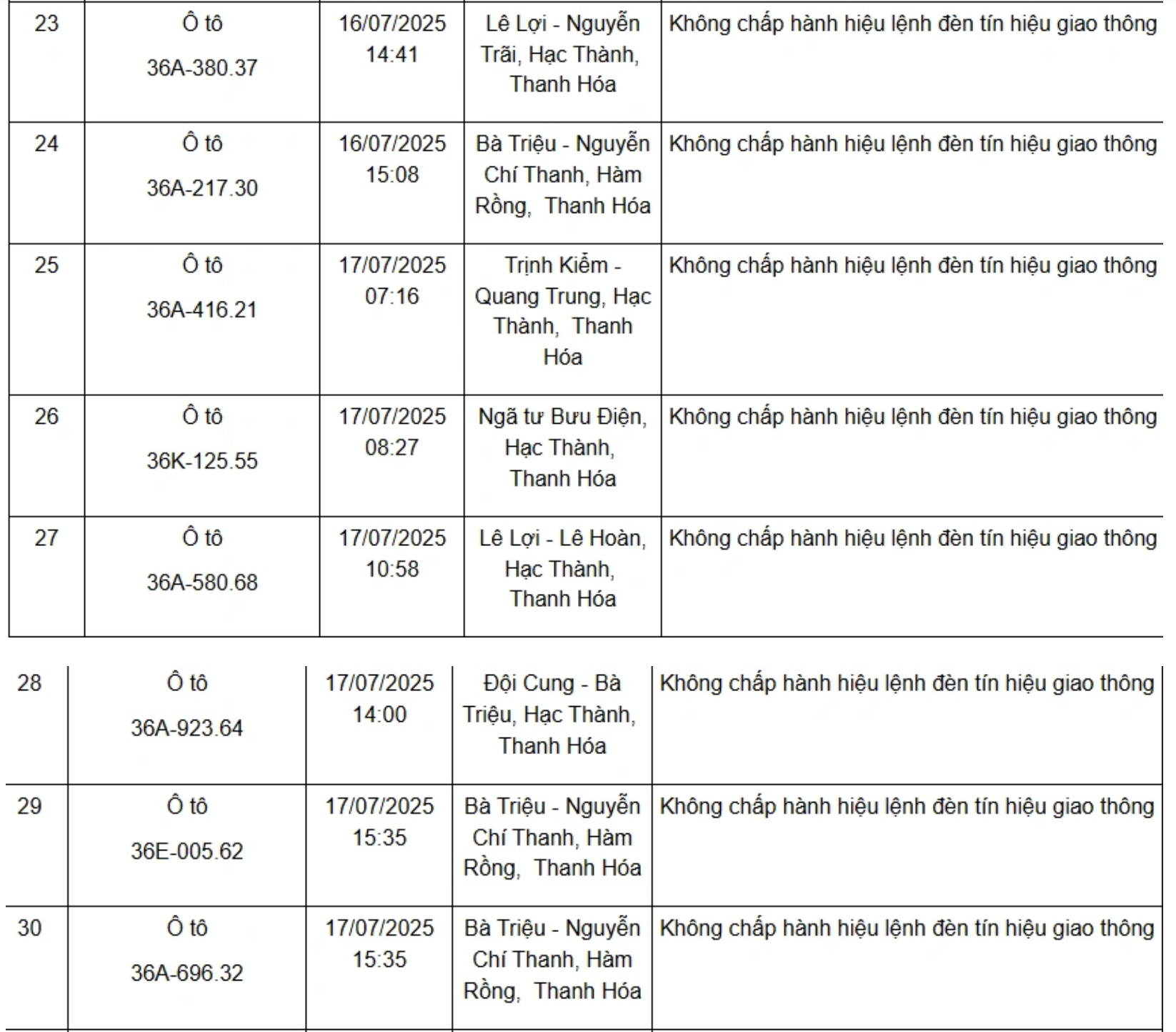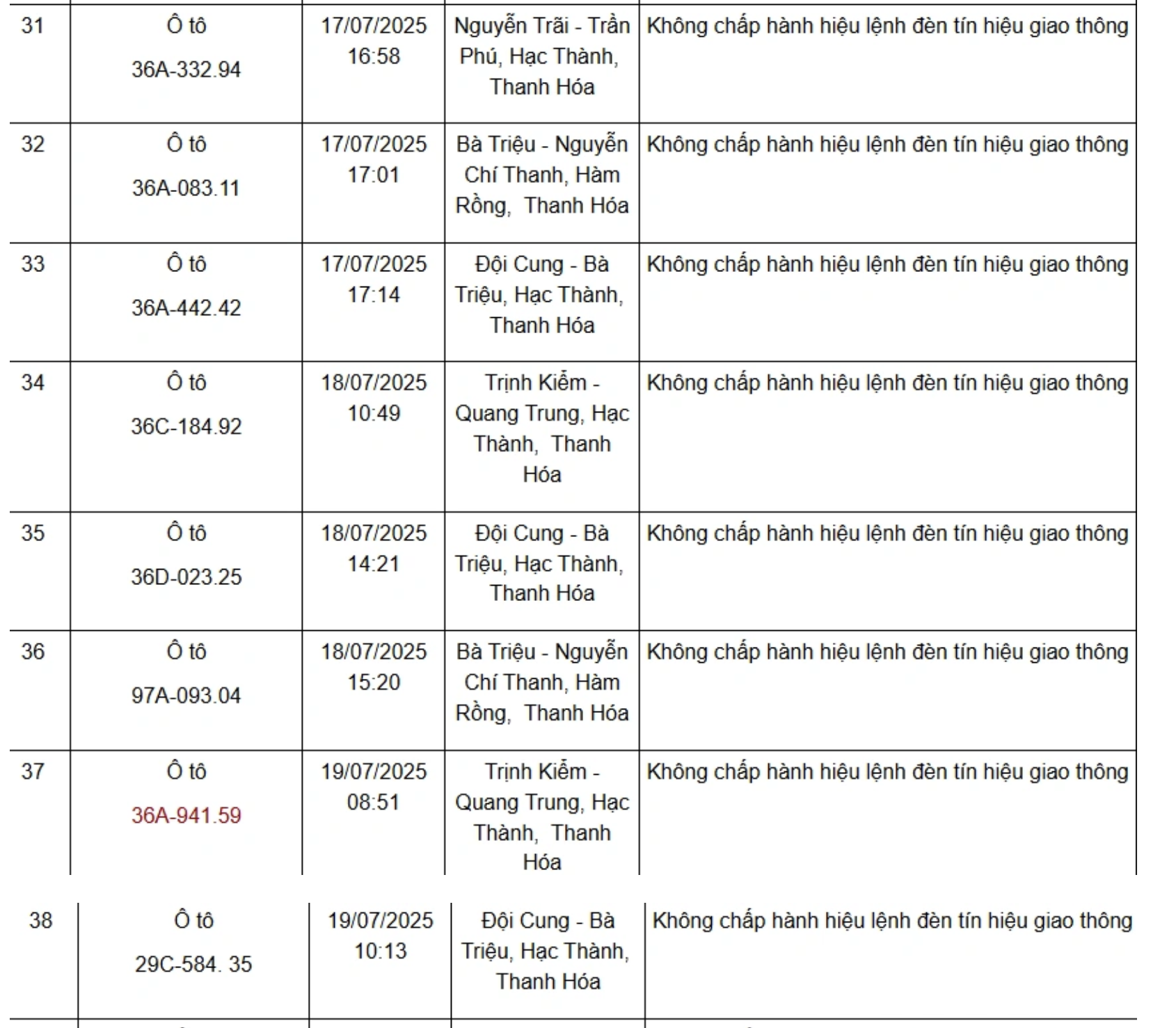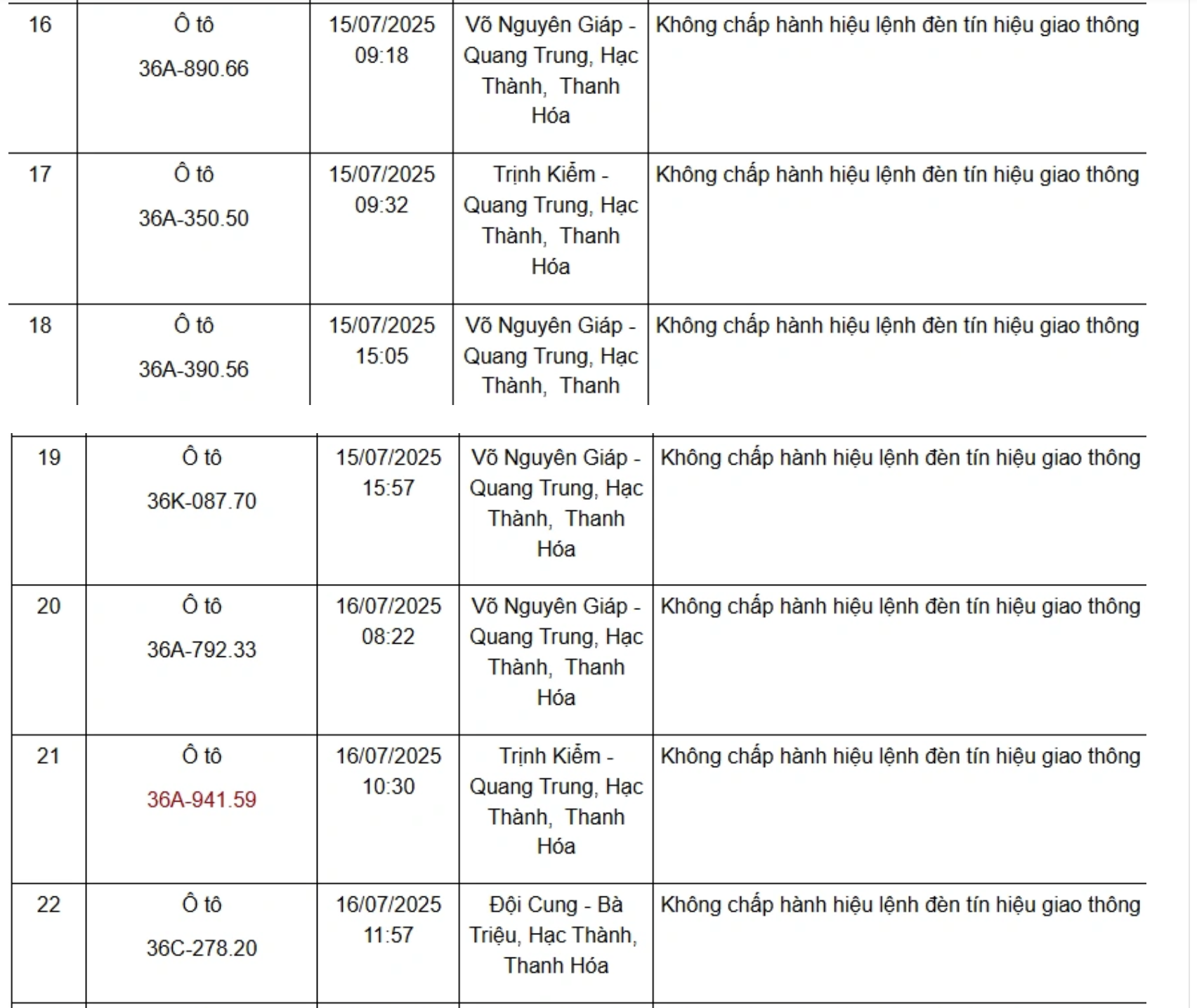 Dưới đây là danh sách 75 phương tiện bị xử phạt nguội từ ngày 11/7/2025 đến ngày 21/7/2025: