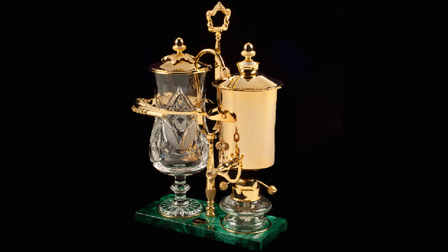 Hãy để những “ông lớn” bỏ qua những tách café Starbucks , thay vào đó là tận hưởng sự thoải mái khi ở nhà và tự mình pha những ly café thơm ngon với một chiếc máy pha cà phê mạ vàng của Royal. Mỗi chiếc máy pha café này được làm thủ công bởi nhà điêu khắc bậc thầy Jean Luc Rieutort và hứa hẹn một ly hoàn hảo.
