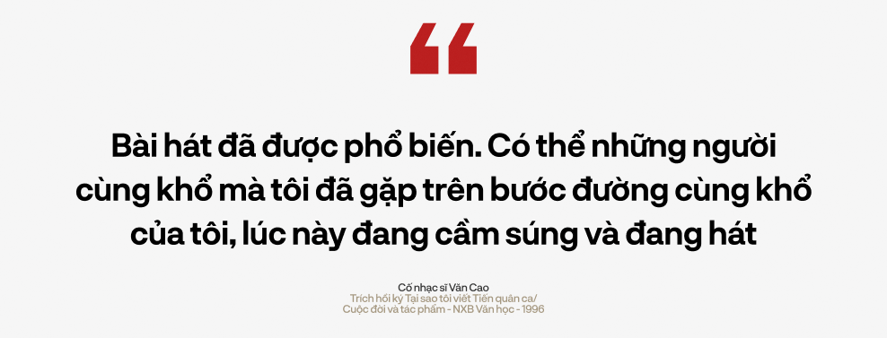 Trong những ngày khốn cùng ấy, cố nhạc sĩ Văn Cao gặp lại một cán bộ Việt Minh vẫn thường theo dõi các hoạt động nghệ thuật của ông trong nhiều năm. Người đồng chí này mời cố nhạc sĩ thoát ly hoạt động, và giao công tác đầu tiên là soạn một bài hát cho quân đội cách mạng vì trên chiến khu đang thiếu bài hát.