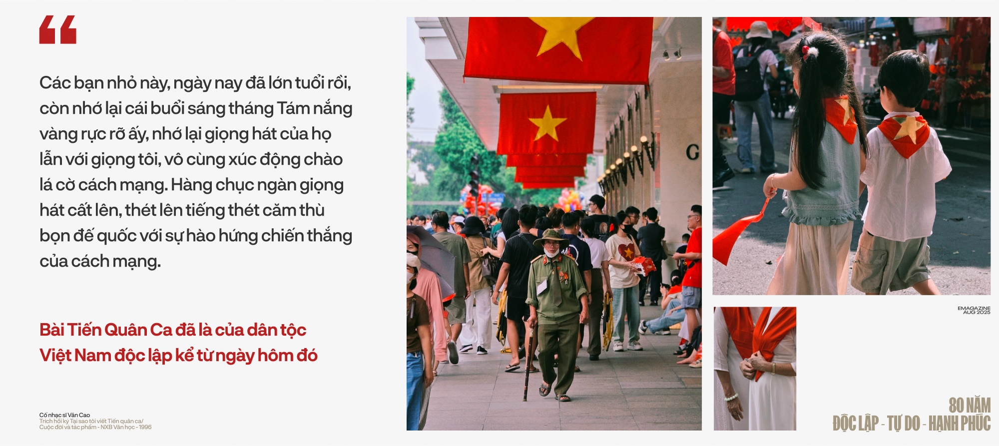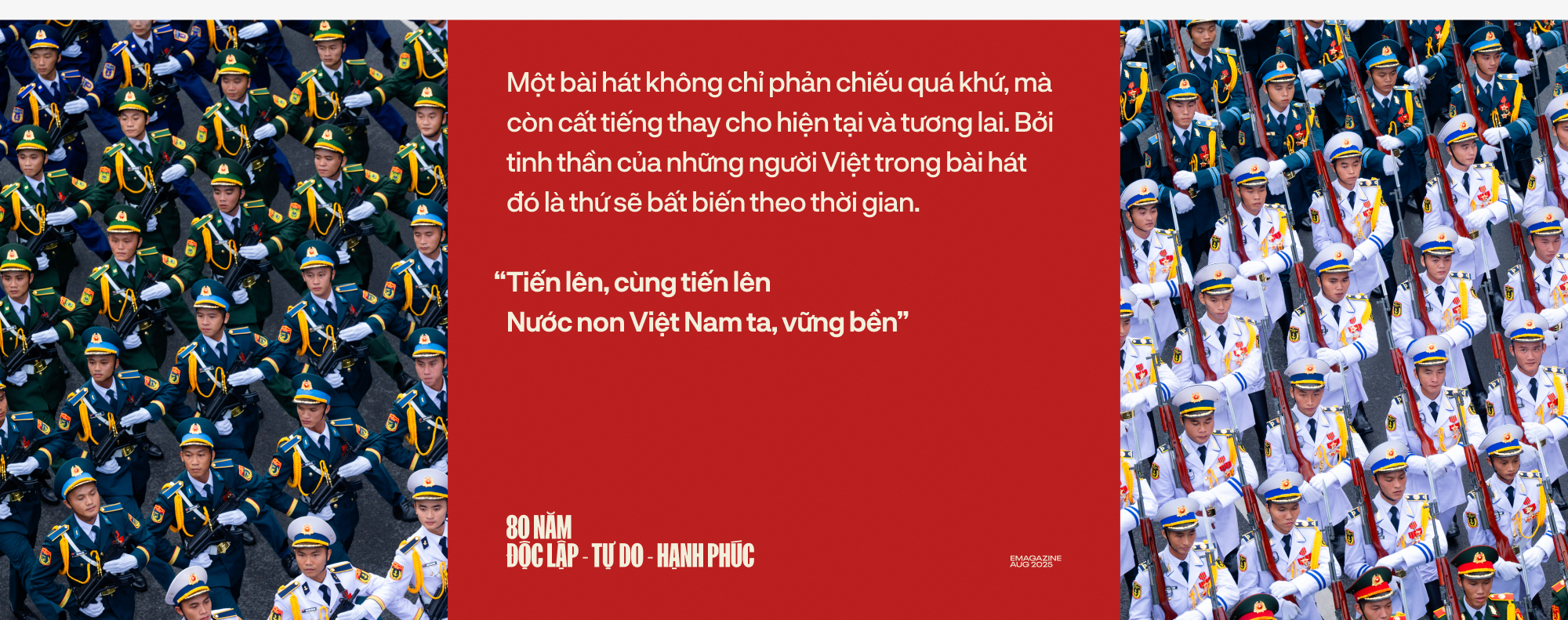 80 năm trước, một đất nước đã vùng lên và giành lấy vận mệnh của chính mình. Sau khi bước ra khỏi cuộc chiến giành lấy độc lập từ tay thực dân sau 100 năm cùng khổ, Việt Nam còn là một đất nước nhỏ bé vừa phải hứng chịu đầy những vết thương. Chắc có lẽ chính cố nhạc sĩ Văn Cao khi đặt bút viết bài Tiến Quân Ca - cũng chưa hình dung được hết hình ảnh một Hà Nội, một Việt Nam rực rỡ, sống động và mạnh mẽ như những ngày này.