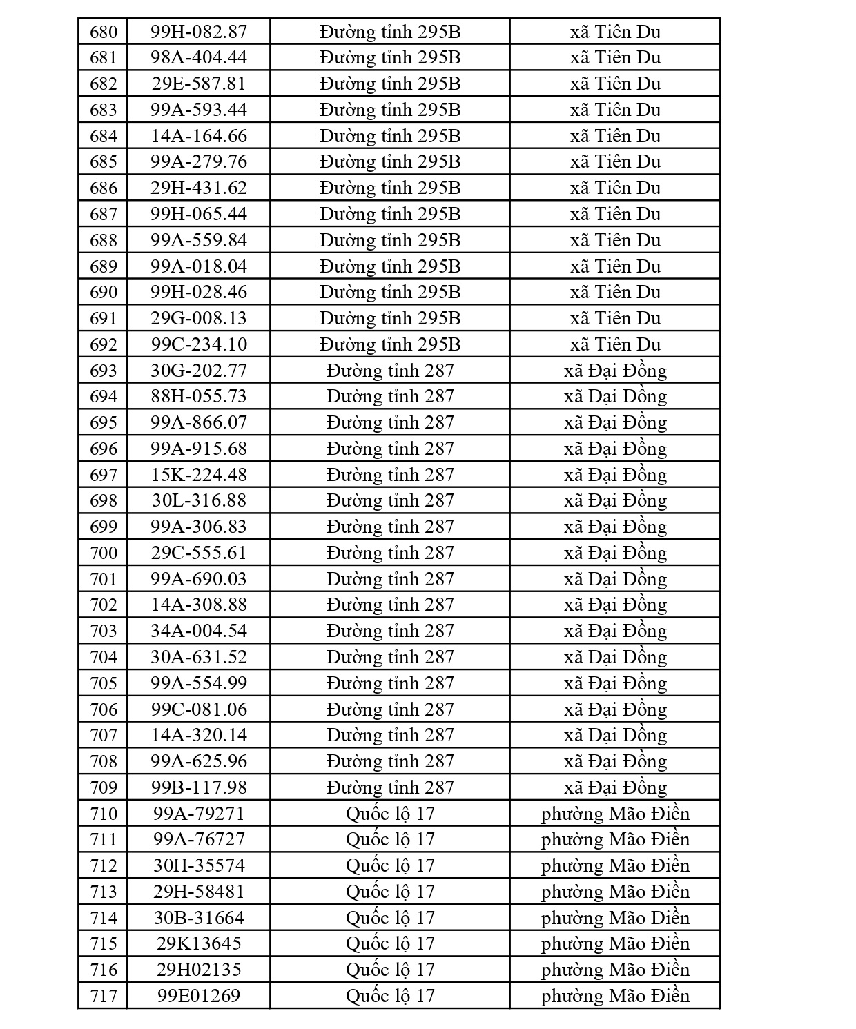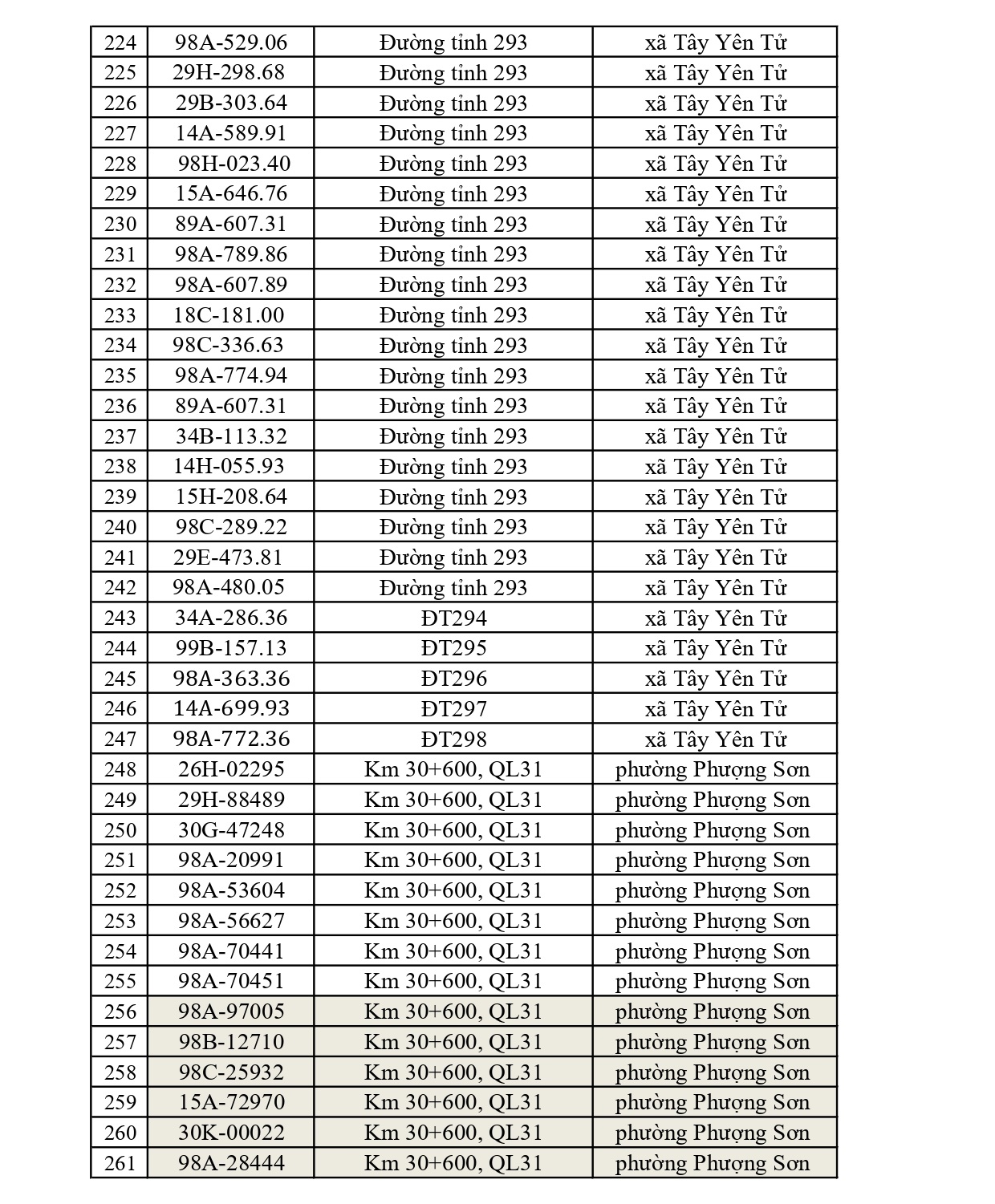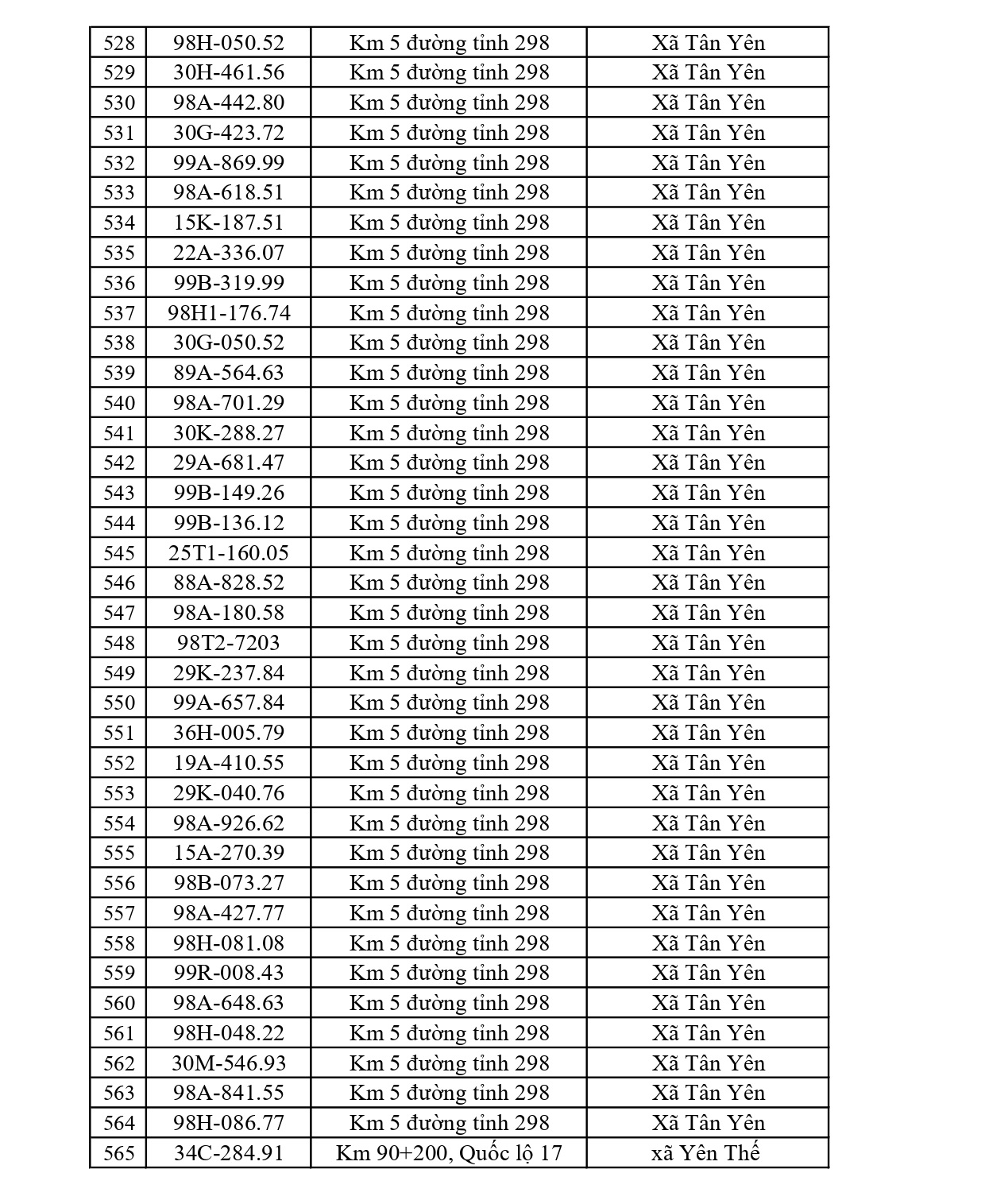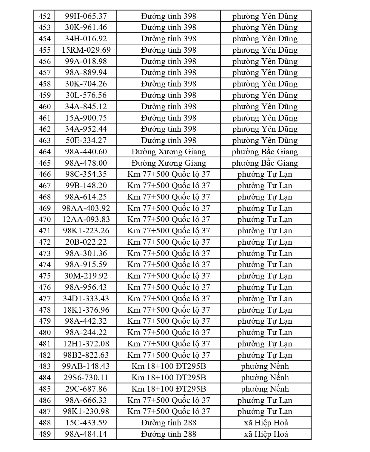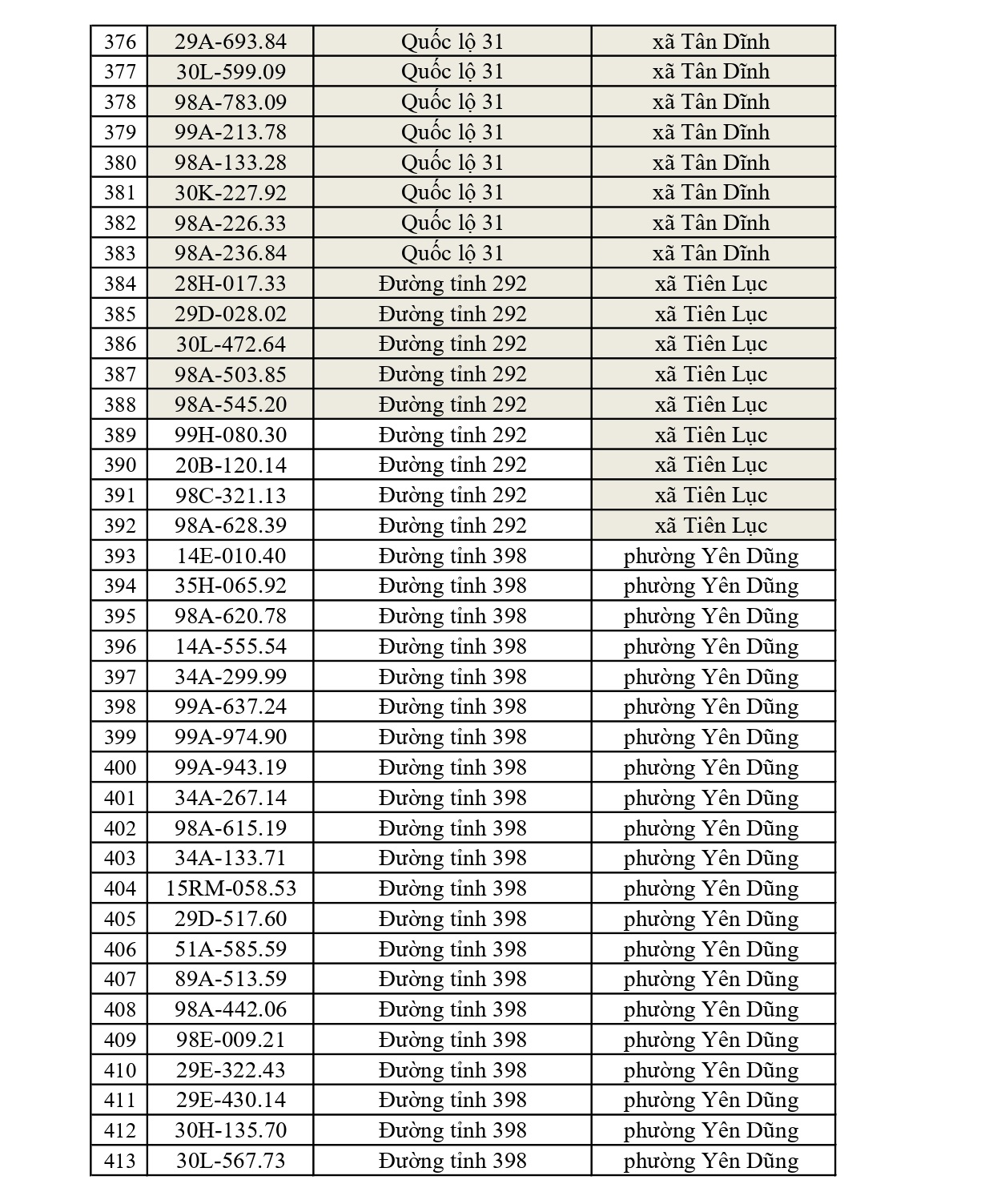 - Đường tỉnh: Tổng 397 trường hợp (ĐT 276: 34; ĐT 284: 47; ĐT 286: 41; ĐT 287: 15; ĐT 288: 26; ĐT 293: 75; ĐT 295: 23; ĐT 295B: 4; ĐT 298: 30; ĐT 299: 36; ĐT 398: 66).