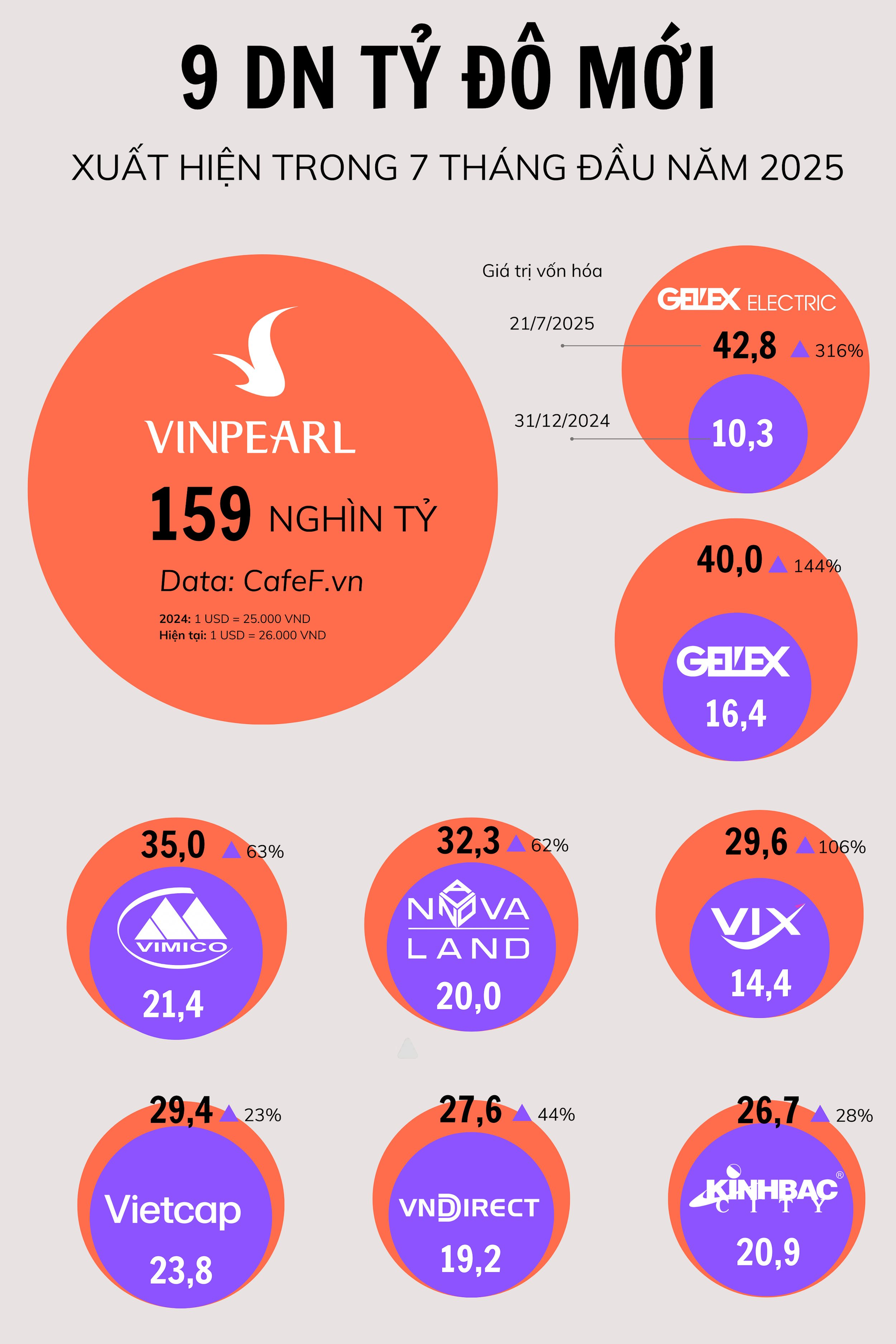 Đến ngày 21/7/2025, đã có một số cái tên tạm biệt mốc tỷ đô như FPT Retail (FRT), Gemadept (GMD) do cổ phiếu giảm giá và tỷ giá tăng lên (tạm tính ở mức 26.000 đồng). Tuy nhiên, có đến 9 doanh nghiệp tỷ đô mới xuất hiện, nhờ mức tăng giá ấn tượng của cổ phiếu.