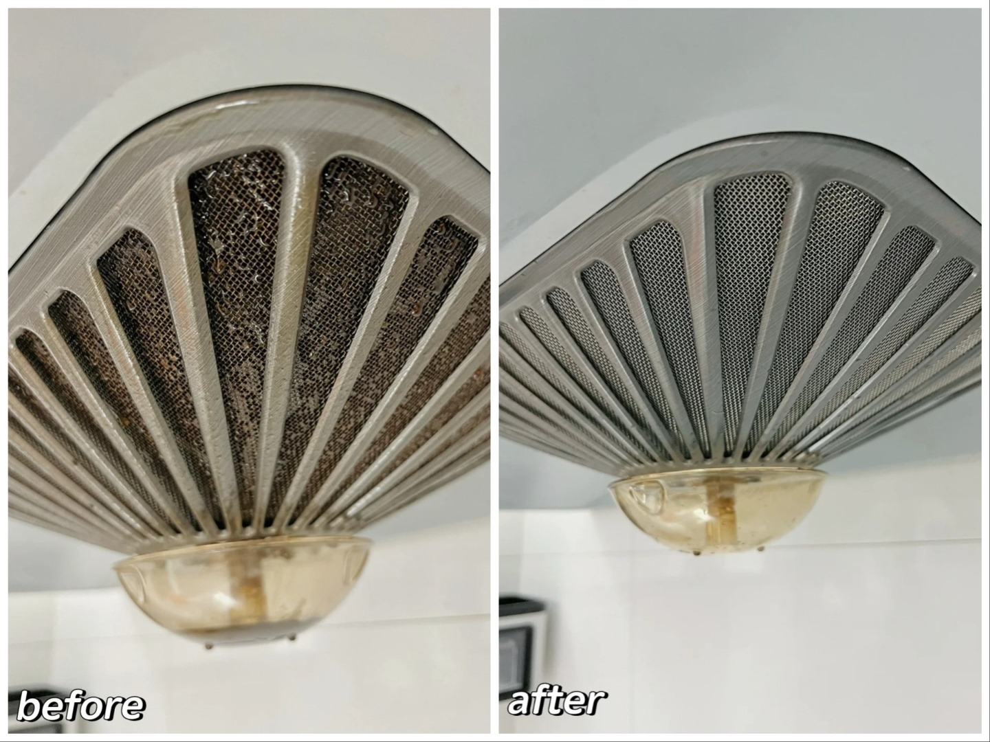 Lưới lọc máy hút mùi cũng là nơi bám dầu mỡ nặng nề. Cách làm đơn giản là tháo lưới, ngâm vào nước sôi cùng oxy già khoảng 4 tiếng, sau đó dùng bàn chải cọ nhẹ. Nếu còn vết bẩn nhỏ, rửa lại bằng nước nóng để dầu mỡ mềm ra, tránh dùng nước lạnh làm dầu cứng lại. Với những ai lười, có thể mua lưới thay thế mới nhưng nhớ chọn đúng loại phù hợp với máy của gia đình.
