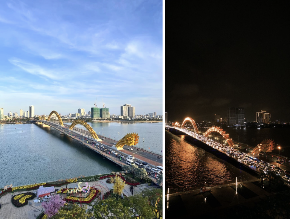 Không chỉ là một trong 9 cây cầu bắc qua sông Hàn, cầu Rồng từ lâu đã trở thành biểu tượng du lịch nổi bật của Đà Nẵng. Lấy cảm hứng từ hình tượng rồng thời Lý bay ra biển Đông, cây cầu dài 666m gây ấn tượng mạnh với khả năng phun lửa và nước - một trải nghiệm hiếm có khiến du khách “đứng hình mất 5 giây” mỗi lần chứng kiến.