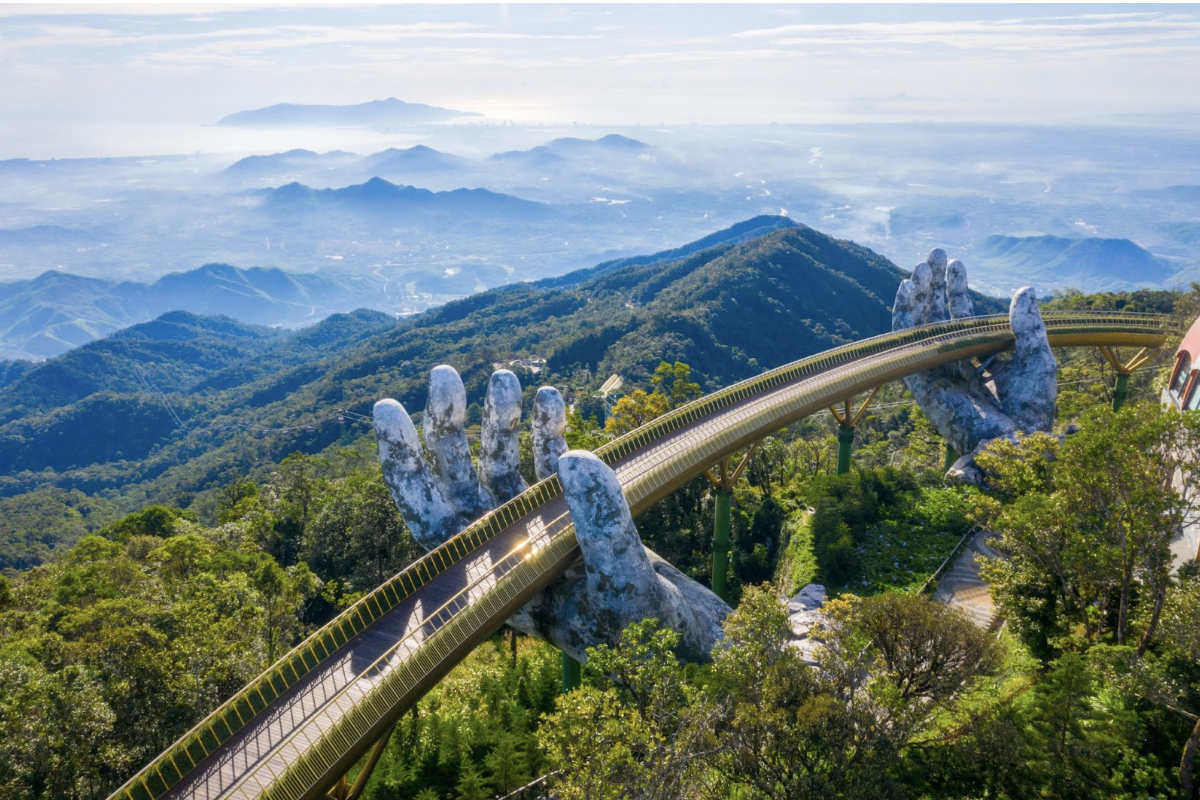 Ra mắt vào tháng 6/2018 tại Bà Nà Hills (Đà Nẵng), cầu Vàng nhanh chóng trở thành hiện tượng truyền thông quốc tế. Cầu dài 150m, nằm ở độ cao hơn 1.400m so với mực nước biển, được thiết kế như dải lụa vàng mềm mại, nâng đỡ bởi đôi bàn tay đá khổng lồ phủ rêu phong.