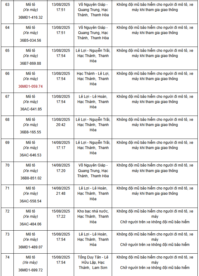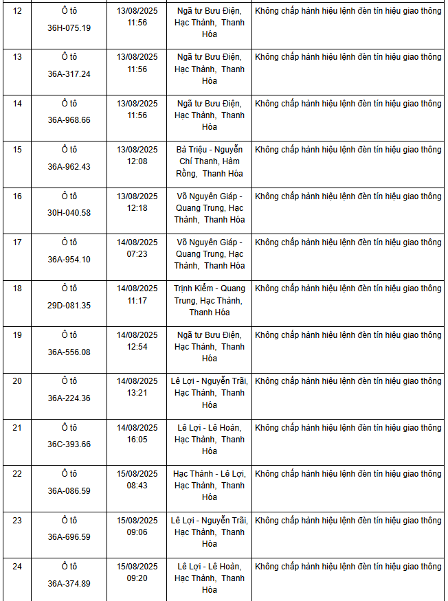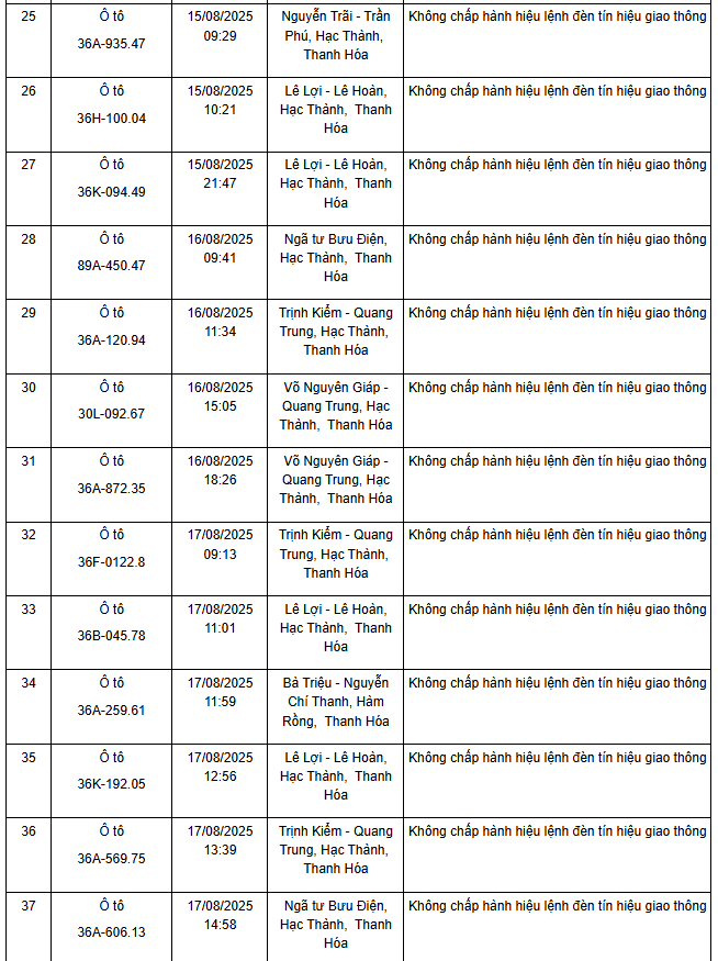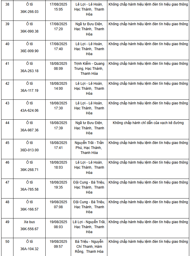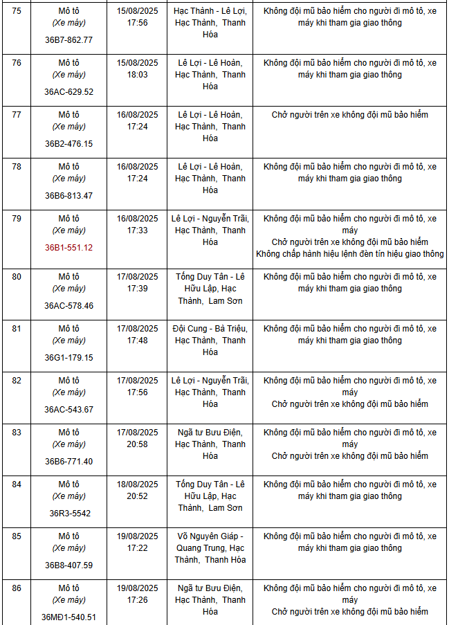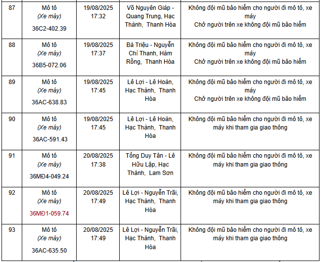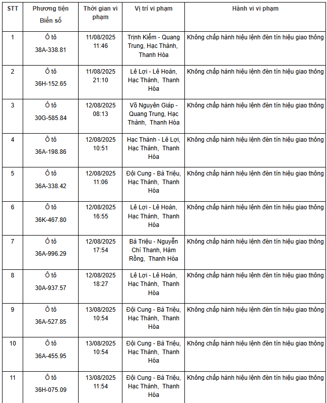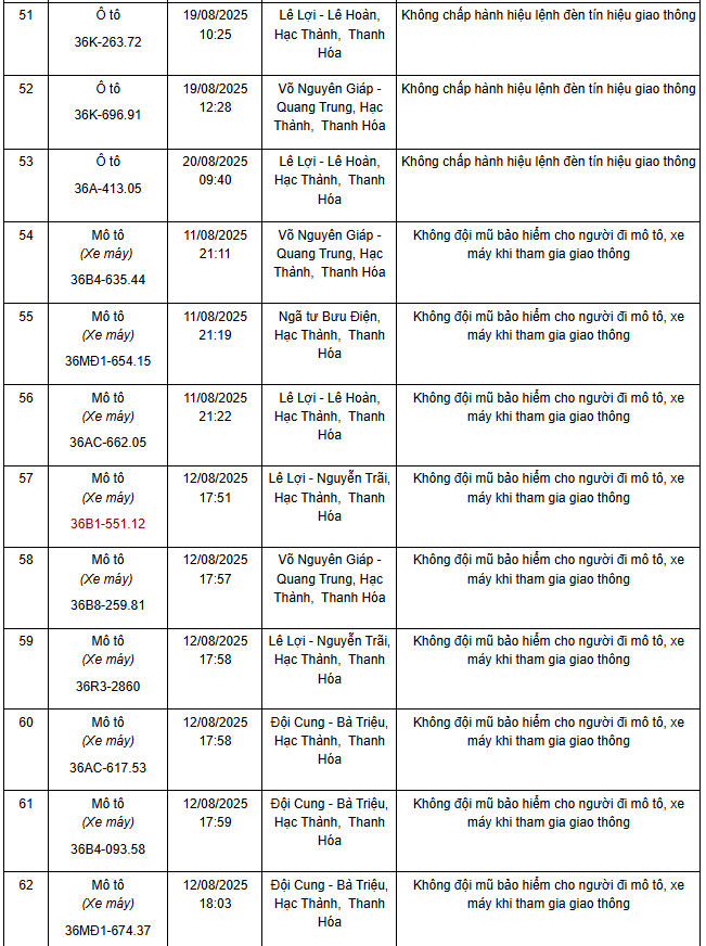 Theo thông báo mới nhất từ Phòng Cảnh sát giao thông Công an tỉnh Thanh Hóa thông báo, từ ngày 11/8/2025 đến ngày 20/8/2025, thông qua thiết bị kỹ thuật nghiệp vụ, các tổ công tác của phòng CSGT đã phát hiện, ghi nhận bằng hình ảnh các trường hợp phương tiện vi phạm về TTATGT. Danh sách biển số vi phạm cụ thể như sau:
