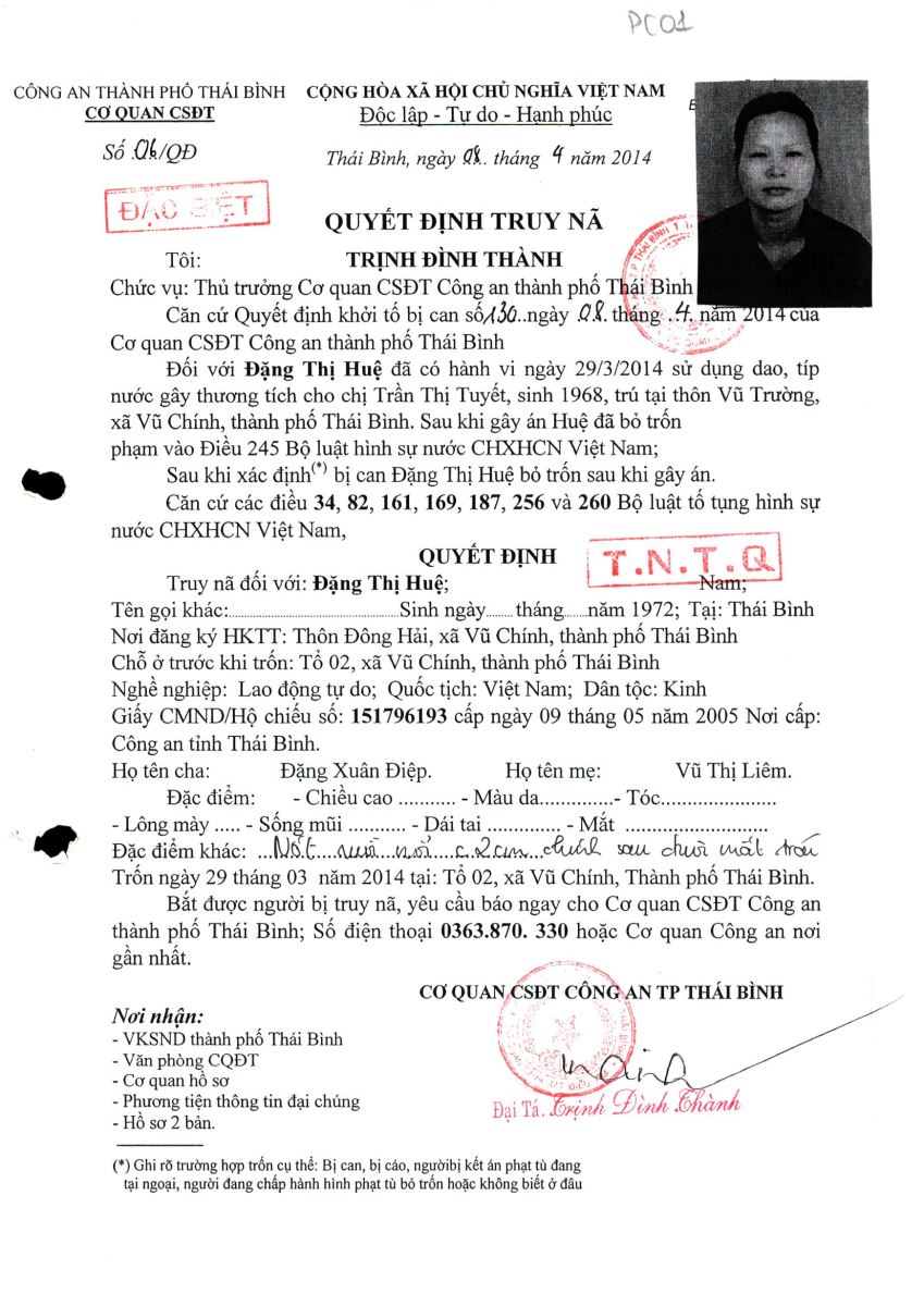 Cơ quan Cảnh sát điều tra Công an tỉnh Hưng Yên (trước đây là Công an thành phố Thái Bình) đã ra Quyết định truy nã số 06/QĐ ngày 8/4/2014 đối với bị can Đặng Thị Huệ.
