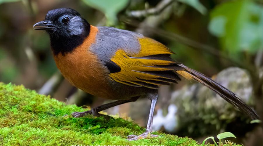 Trong số đó, Khướu đầu đen má xám nổi bật nhờ bộ lông sặc sỡ và tiếng hót trong trẻo. Chim trưởng thành dài khoảng 26 – 28 cm, đầu đen tuyền, hai bên má và quanh mắt có sắc xám bạc, tạo nên vẻ tương phản rõ nét. Ngực và bụng phủ màu nâu đỏ gỉ sắt, vòng cổ và lưng trên ánh nâu đỏ, trong khi cánh mang sắc vàng ôliu pha đen và nâu hạt dẻ. Đuôi chim cũng có viền vàng ôliu mềm mại, tạo cảm giác vừa mạnh mẽ vừa duyên dáng.