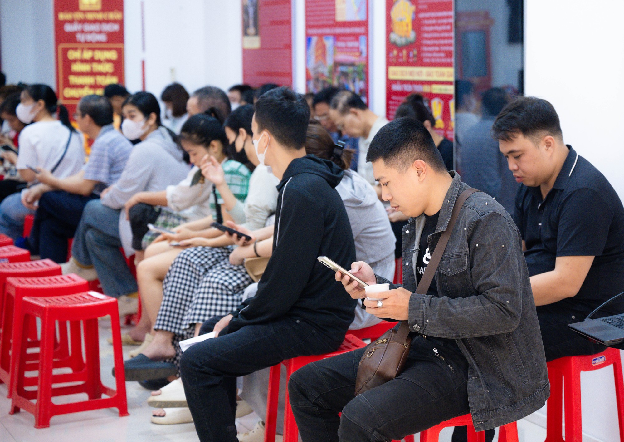 Người dân ngồi kín hai hàng ghế chờ đợi đến lượt giao dịch