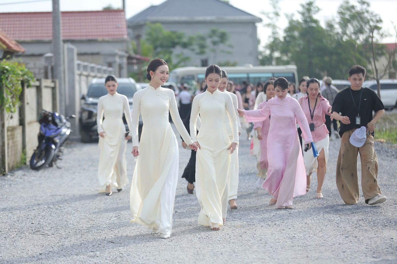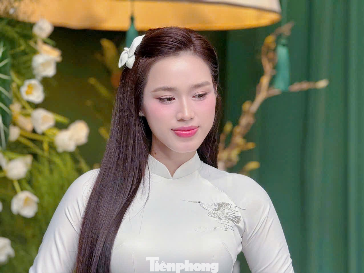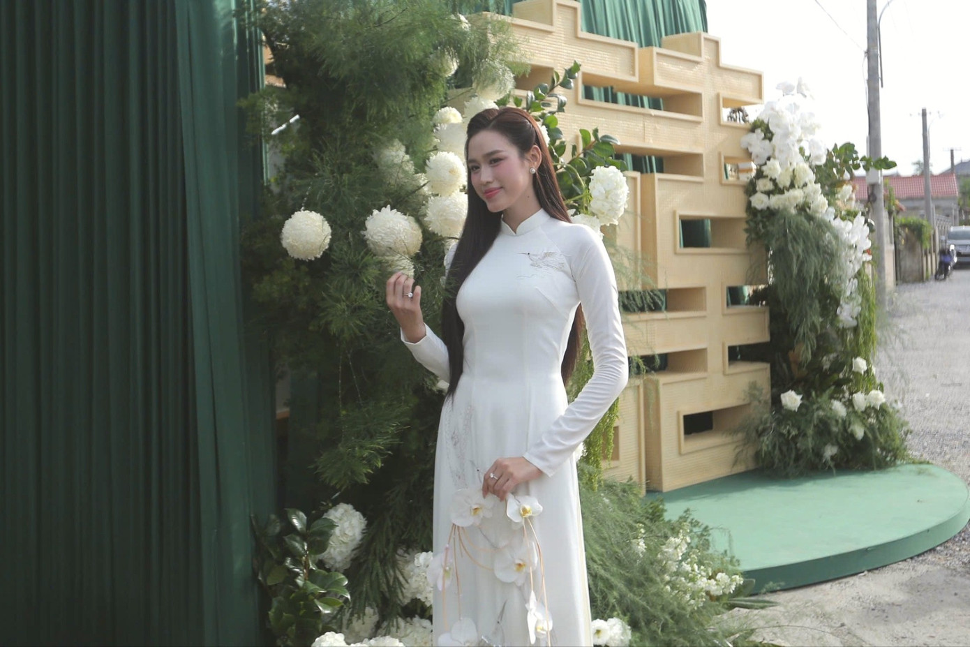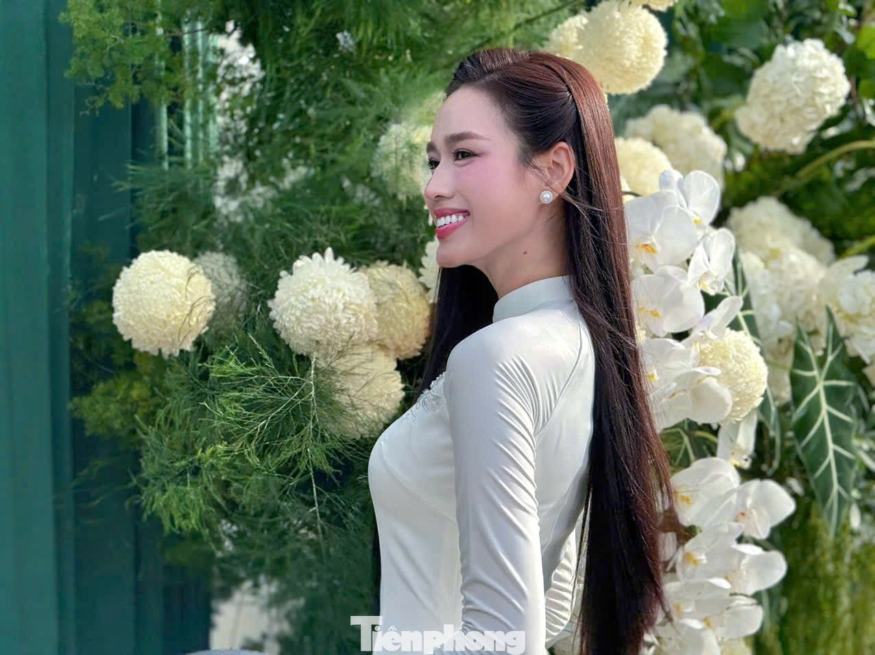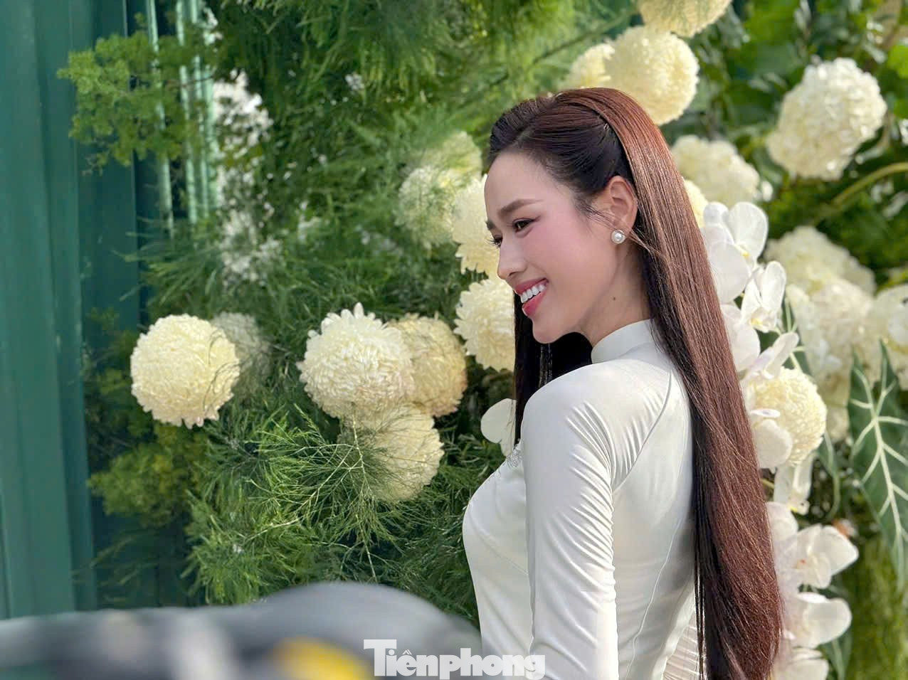 Đỗ Thị Hà xuất hiện với phong thái dịu dàng. Cô chọn áo dài trắng đơn giản, không đính kết quá cầu kỳ.