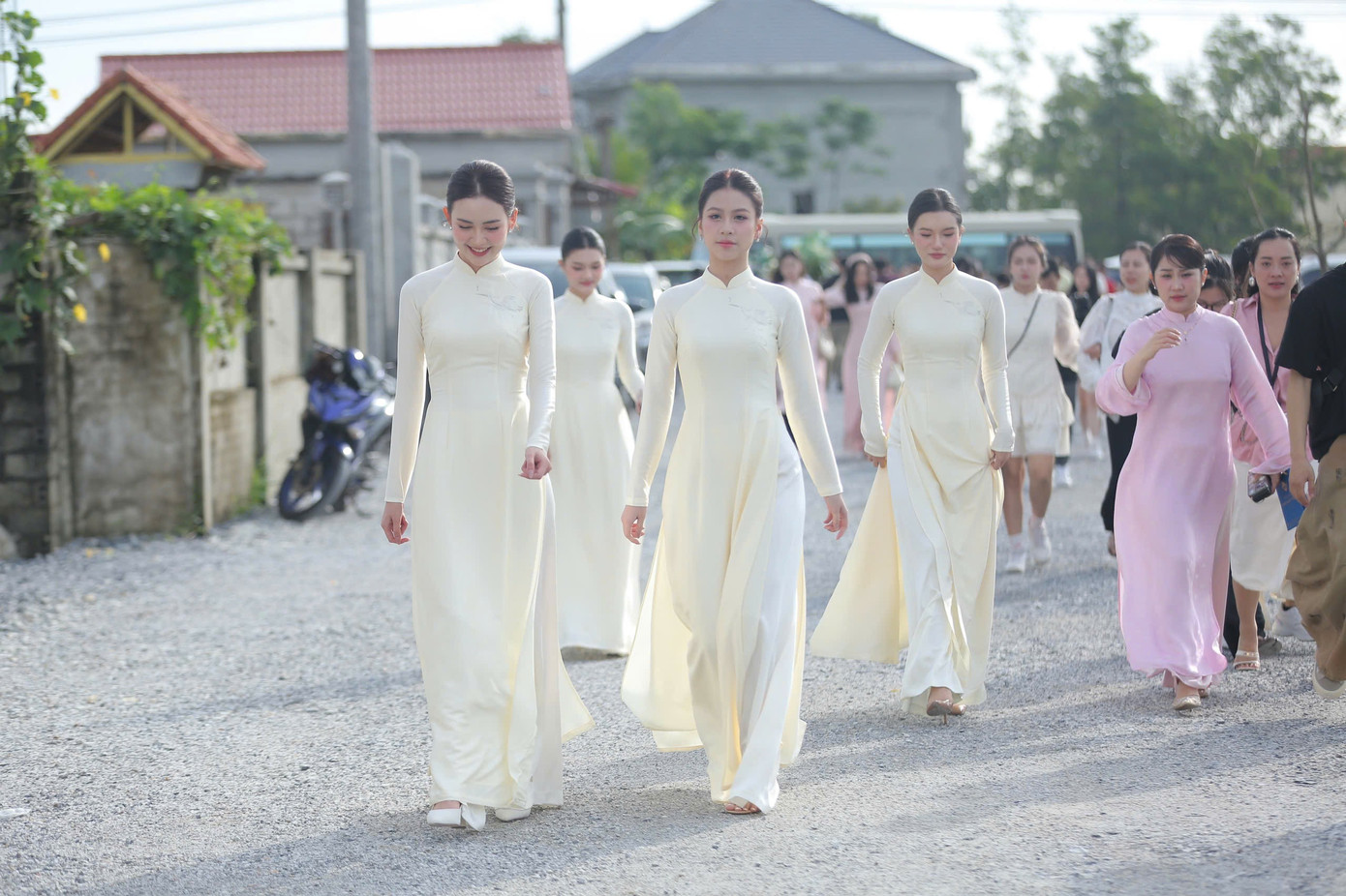 Khoảng 8h, gia đình nhà trai tới tư gia nhà gái ở Thanh Hóa. Chú rể Viết Vương cũng chọn áo dài trắng đồng điệu với cô dâu.