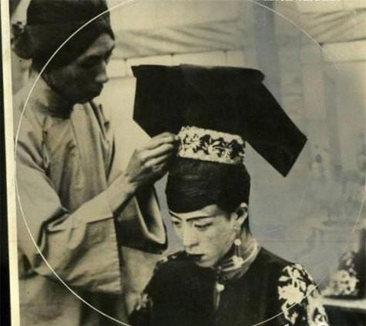 Trong loạt ảnh cổ, hình ảnh tân nương được các tỳ nữ giúp vấn tóc và khoác y phục cưới đặc biệt gây chú ý. Phía trên đầu nàng là chiếc mũ "Điền tử" - món trang sức chỉ giới quý tộc hoặc nữ nhân trong cung đình mới được phép sử dụng. Điều này cho thấy cô dâu nhiều khả năng xuất thân từ gia đình quyền thế hoặc quan lại triều đình. (Ảnh: Sohu)