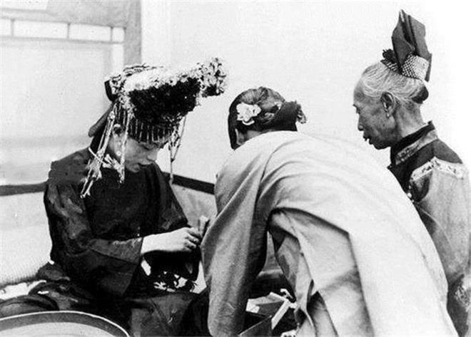 Lễ thành hôn là nghi thức được xem là đỉnh cao của sự trang trọng và quy củ trong xã hội phong kiến. Qua ống kính của một nhiếp ảnh gia phương Tây, từng khoảnh khắc trong ngày trọng đại của tiểu thư quyền quý được lưu giữ sống động, hé mở nhiều chi tiết tinh tế về văn hóa cưới hỏi của triều đại cuối cùng trong lịch sử phong kiến Trung Hoa. Trong ảnh là Trưởng bối giúp cô dâu trang điểm. (Ảnh: Sohu)