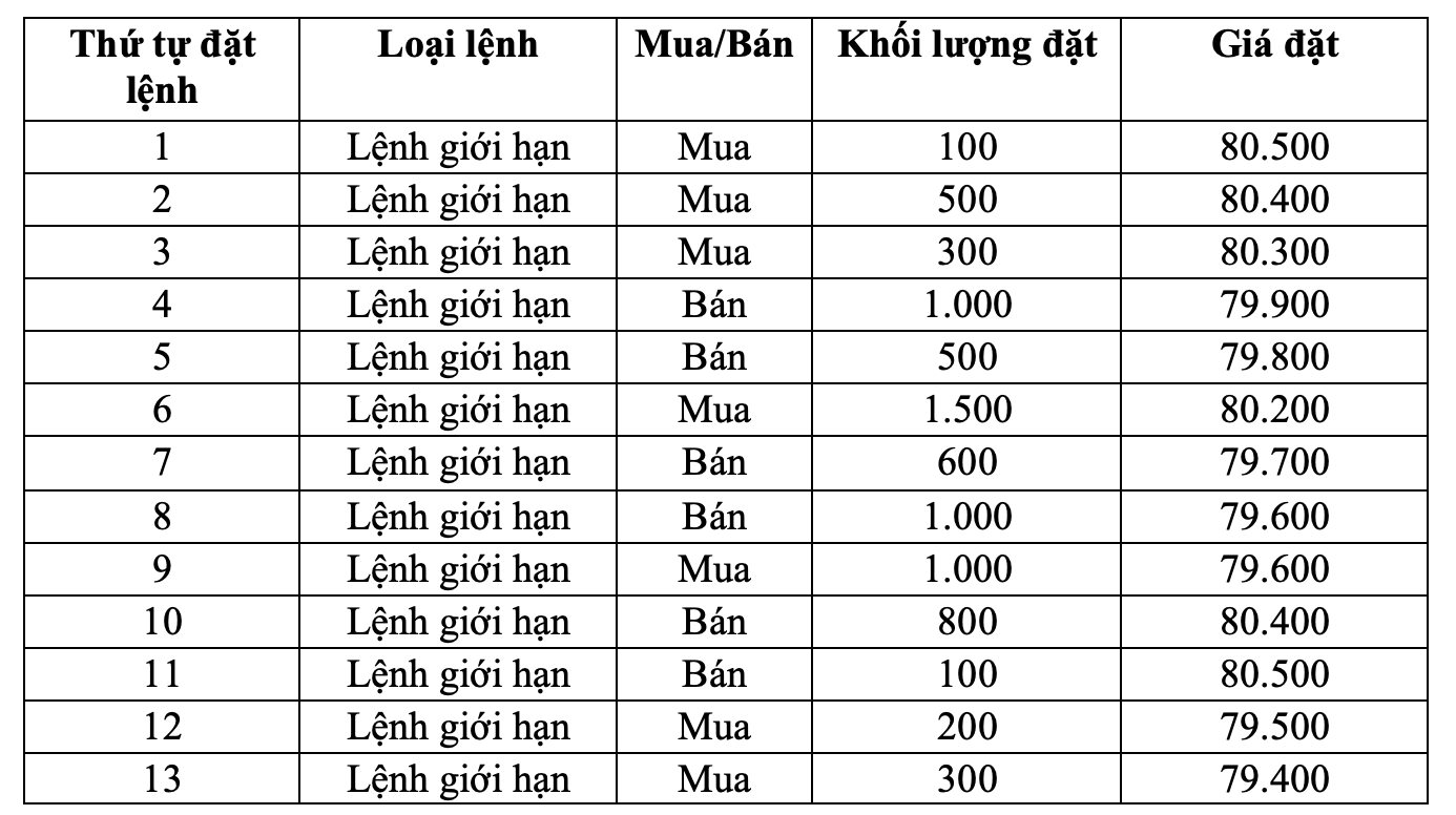 Ví dụ : Trong đợt khớp lệnh định kỳ xác định giá mở cửa, cổ phiếu E (giá tham chiếu: 80.000, giá trần: 85.600; giá sàn: 74.400) có sổ lệnh như sau: