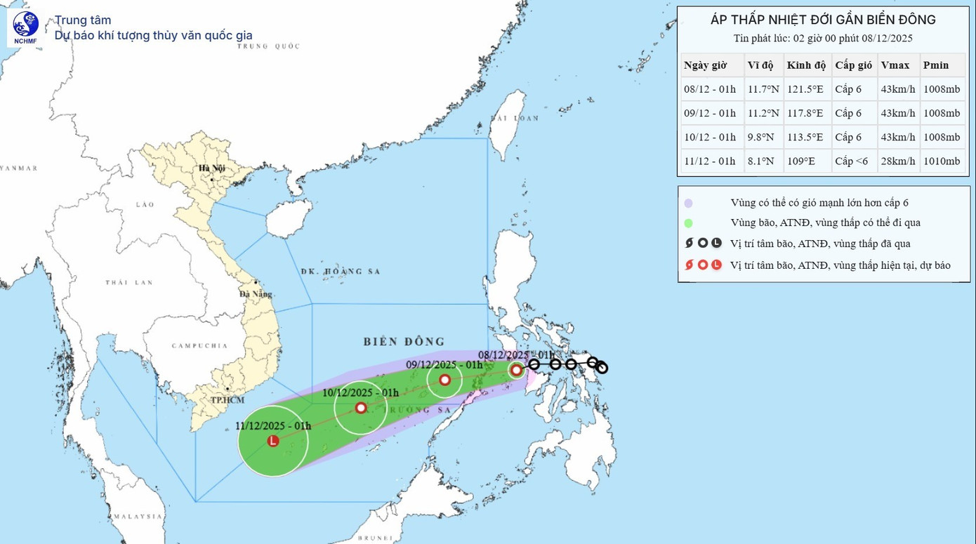 Đến 1h ngày 9/12, áp thấp nhiệt đới di chuyển theo hướng Tây Tây Nam 15–20 km/h, vị trí tâm ở vào khoảng 11,2 độ Vĩ Bắc, 117,8 độ Kinh Đông, trên vùng Đông Nam giữa Biển Đông. Sức gió mạnh nhất vùng gần tâm áp thấp nhiệt đới mạnh cấp 6, giật cấp 8. Cảnh báo rủi ro thiên tai cấp 3 ở vùng biển phía Đông Nam khu vực giữa Biển Đông (bao gồm vùng biển phía Đông Bắc đặc khu Trường Sa).