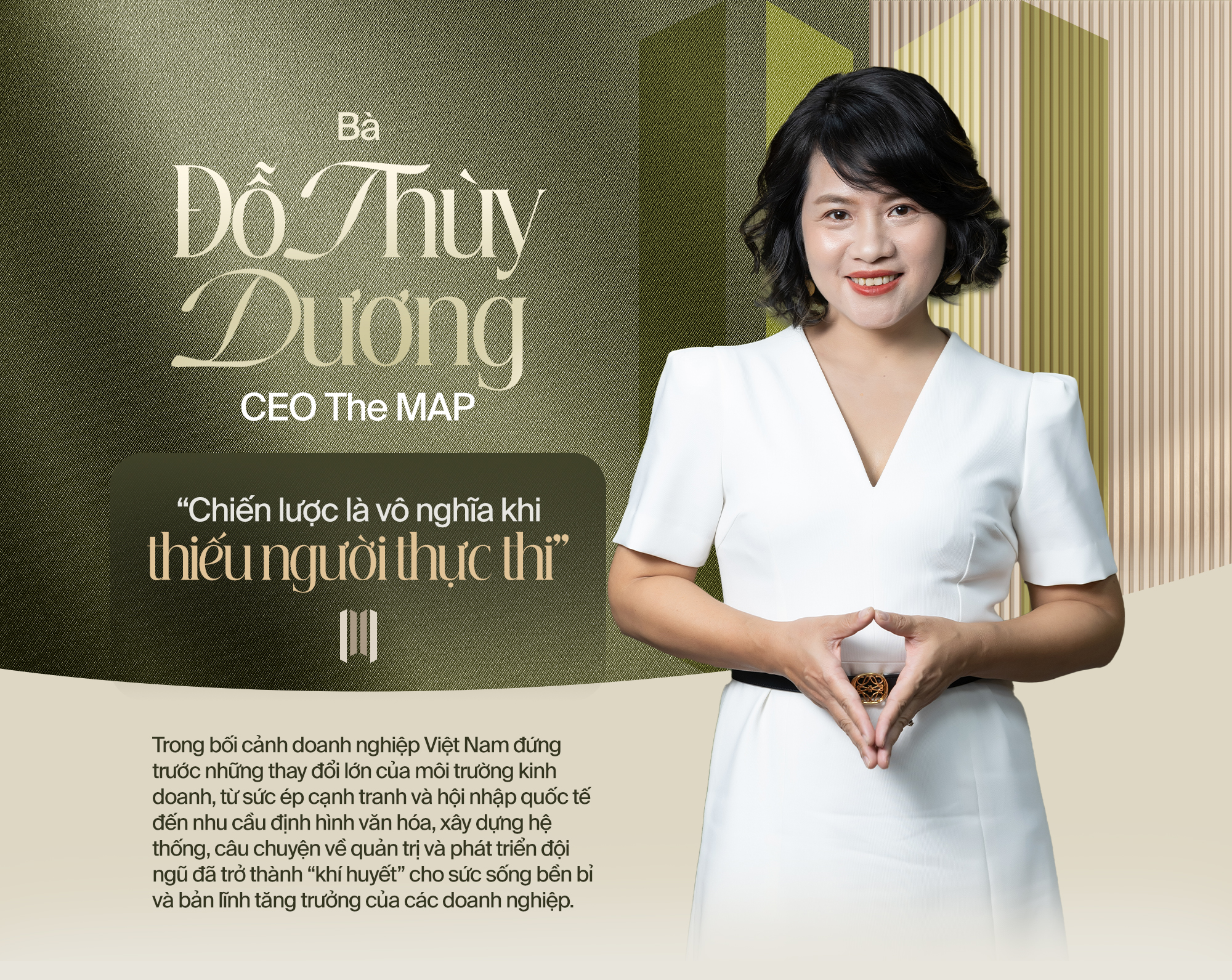 Với hơn 20 năm kinh nghiệm tư vấn và đồng hành cùng nhiều tập đoàn lớn, bà Đỗ Thùy Dương – CEO The MAP – được nhắc đến như một trong những chuyên gia hàng đầu về phát triển tổ chức và năng lực lãnh đạo.