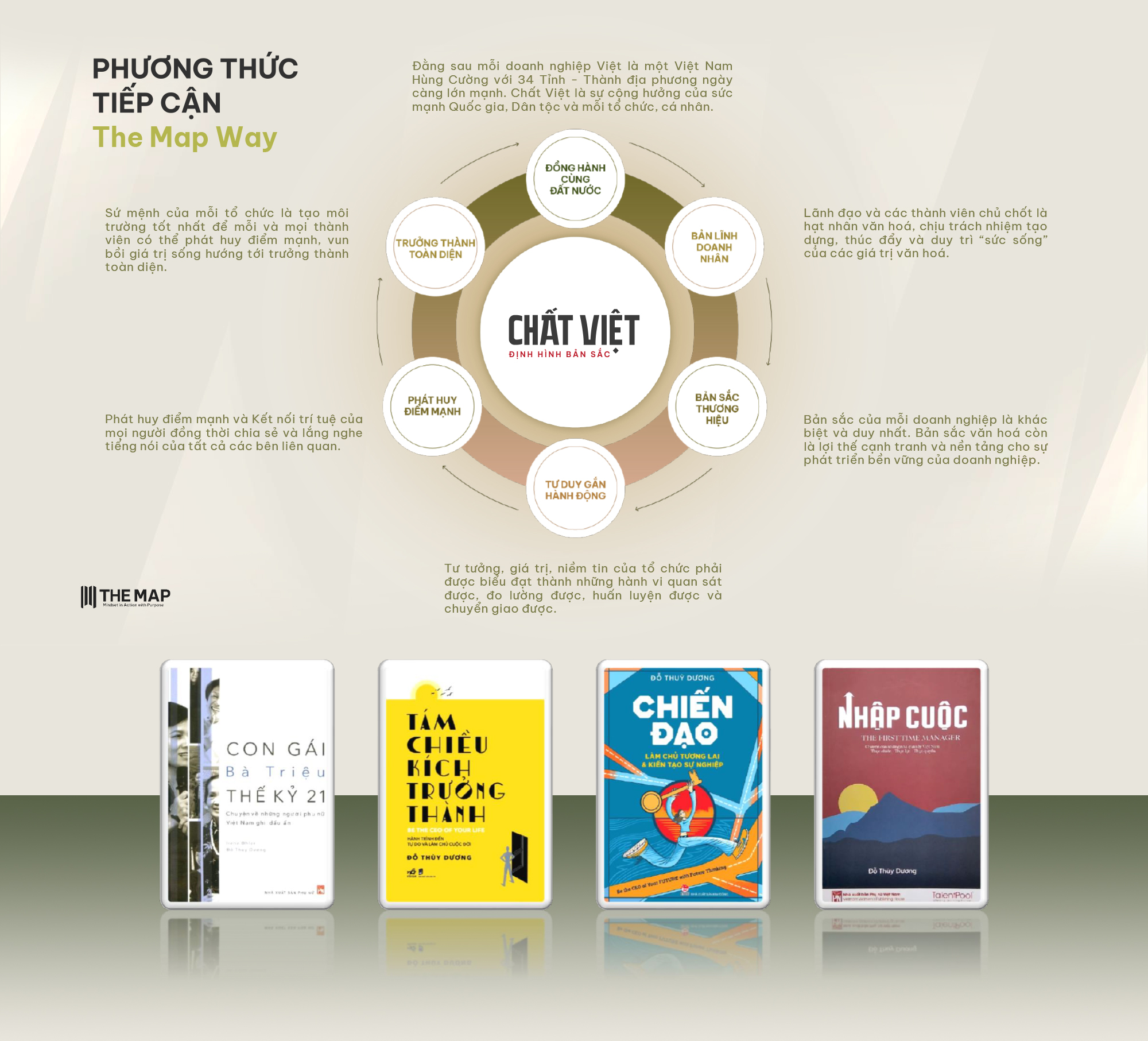 Để văn hóa doanh nghiệp thật sự bền vững, tôi tin cần khơi dậy mạch nguồn văn hóa – lịch sử – nghệ thuật của dân tộc. Chúng ta dễ bị cuốn vào guồng quay công việc và bỏ đói đời sống tinh thần, tâm linh, đó là một dạng thức đặc biệt của tài sản. The MAP (bản đồ quản trị Việt) vì thế sẽ mang vào doanh nghiệp những "món ăn tinh thần" – từ nghệ thuật, lịch sử, văn hoá đến sự lý giải thấu đáo các phong tục, tập quán – như một chiếc cầu nối để mỗi người lao động hiểu rõ mình là ai, mình thuộc về đâu. Khi có gốc rễ vững chắc, con người không còn hoang mang, không còn rơi vào khủng hoảng hiện sinh hay phải tìm cách "chữa lành" mà sẽ tự tin đóng góp giá trị thực sự cho bản thân, gia đình, tổ chức…