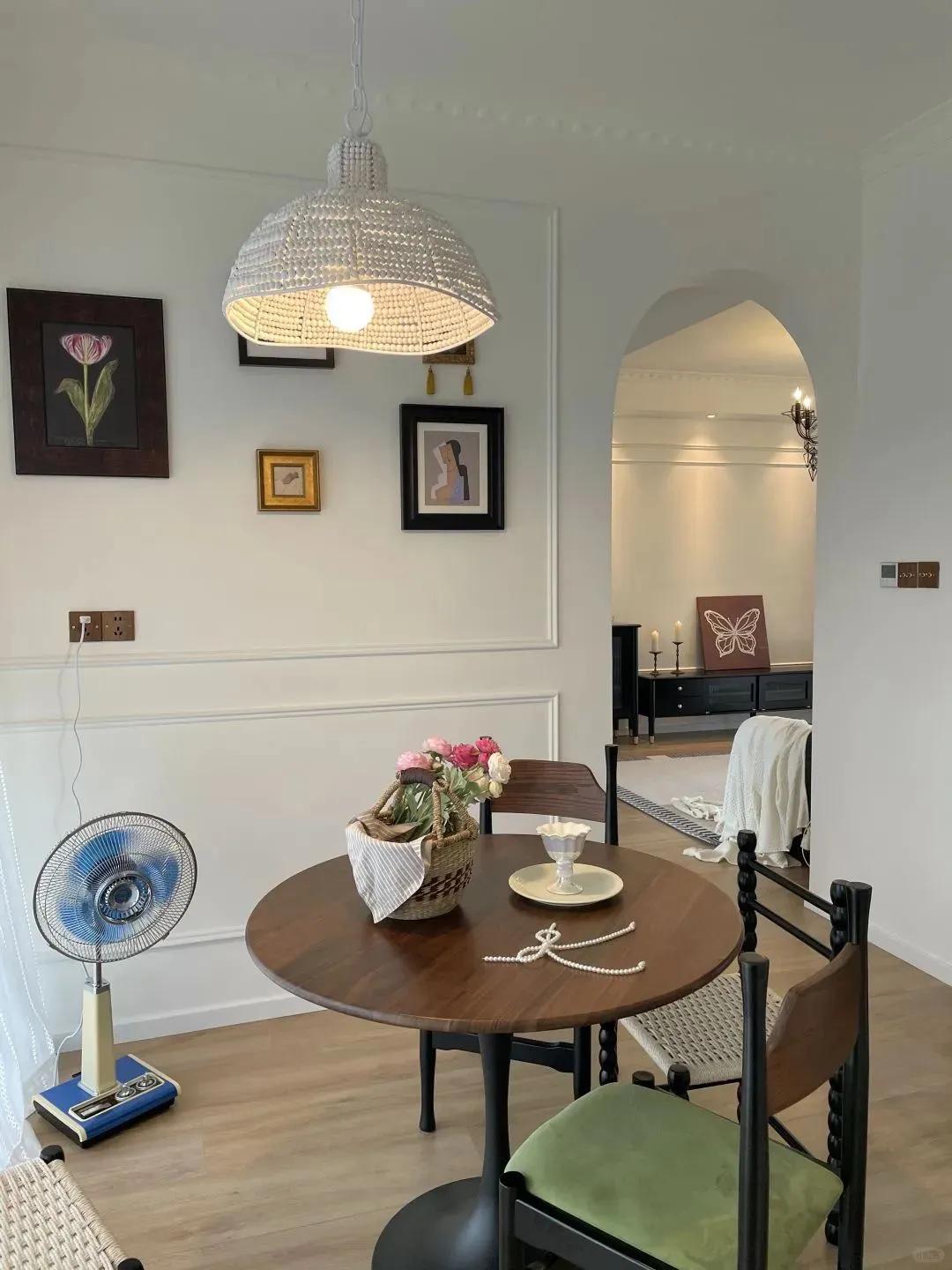 Bàn ăn luôn được lau sạch sau mỗi bữa. Hệ thống ánh sáng vàng nhẹ tạo cảm giác ấm áp, khiến bữa ăn gia đình trở nên thư giãn hơn.
