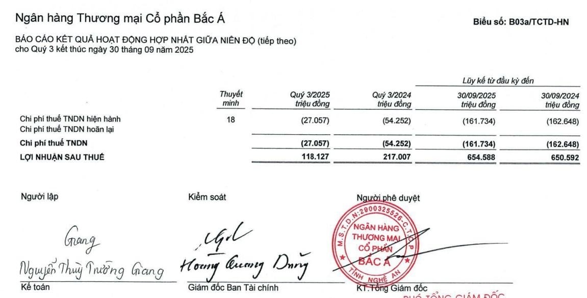 Về tình hình kinh doanh, theo báo cáo tài chính hợp nhất quý III/2025, Bac A Bank ghi nhận lợi nhuận trước thuế hợp nhất đạt 145 tỷ đồng, giảm gần 47% so với cùng kỳ năm 2024. Trừ thuế, ngân hàng báo lãi 118,1 tỷ đồng, giảm 45,6% so với quý III năm trước.
