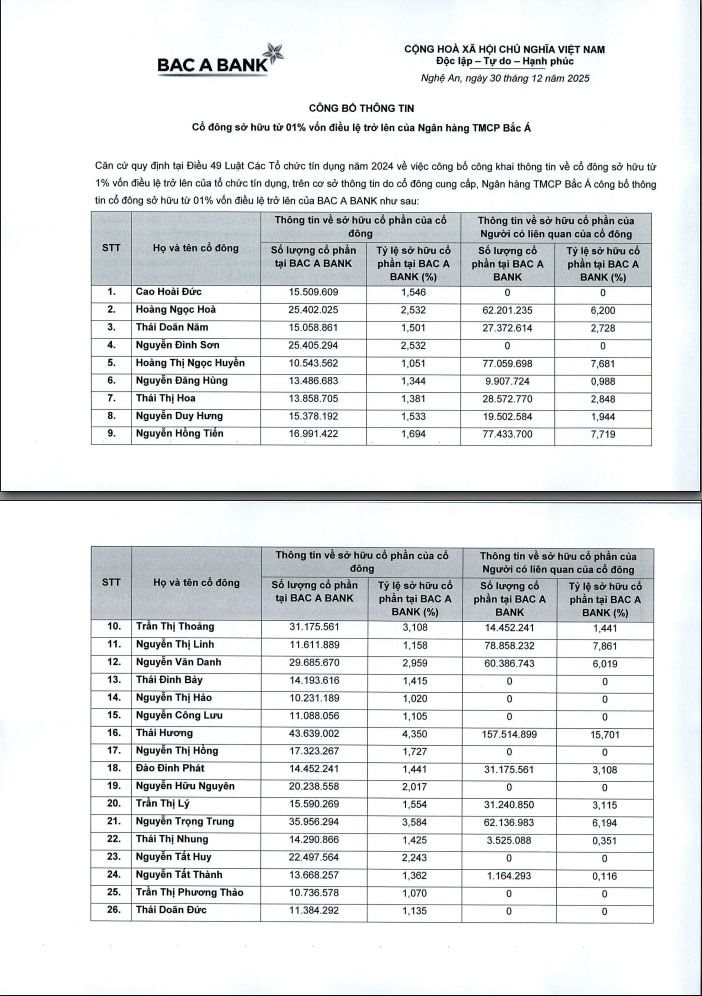 Theo đó, tại thời điểm 30/12/2025, theo công bố từ Ngân hàng TMCP Bắc Á (Bac A Bank), bà Thái Hương – Tổng Giám đốc ngân hàng đang sở hữu 43.639.002 cổ phần tại Bac A Bank, tương ứng với tỷ lệ sở hữu ở mức 4,350%.