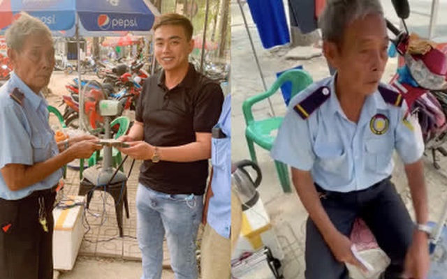 Anh Hải trao tận tay bác bảo vệ số tiền được mọi người giúp đỡ sau khi đọc được hoàn cảnh của bác