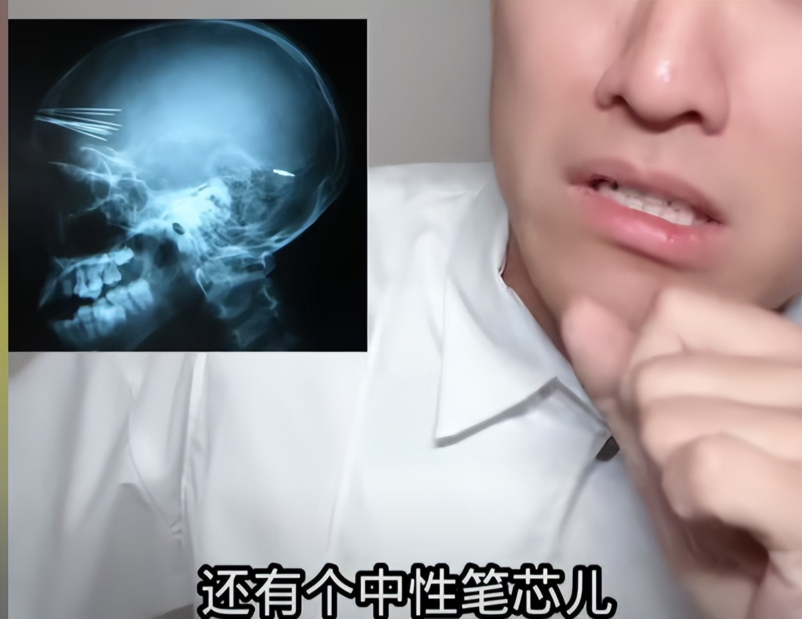 Một bệnh nhân có một kim tiêm và ruột bút gel mắc kẹt trong não. Ngoài ra, còn có một cây kim được đưa vào khoảng trống giữa các xương mặt của bệnh nhân.