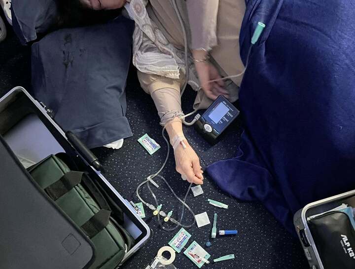 Khoảng 10 phút sau truyền dịch, tình trạng bệnh nhân có dấu hiệu cải thiện rõ rệt, huyết áp dần ổn định, bệnh nhân tỉnh táo hơn và có thể giao tiếp trở lại. Sự phối hợp giữa bác sĩ và tổ bay giúp kiểm soát tình huống kịp thời.