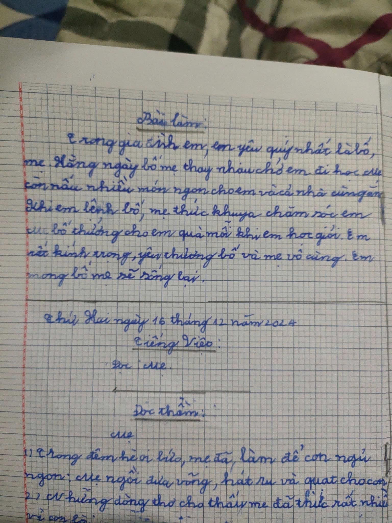 Mới đây, một bài tập làm văn lan truyền trên mạng xã hội thu hút sự chú ý. Đó là một bài làm rất quen thuộc: con kể về bố mẹ, về những bữa cơm gia đình, về việc được chăm sóc, được yêu thương.