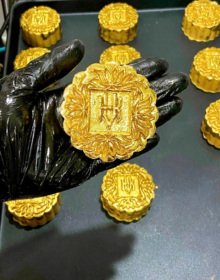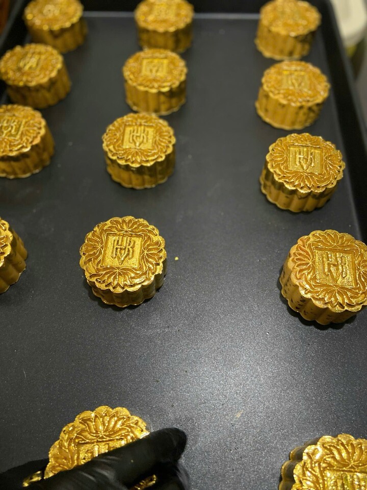 Bánh trung thu sau khi nướng được để nguội và phủ một lớp vàng lá 24K. (Ảnh: NVCC).