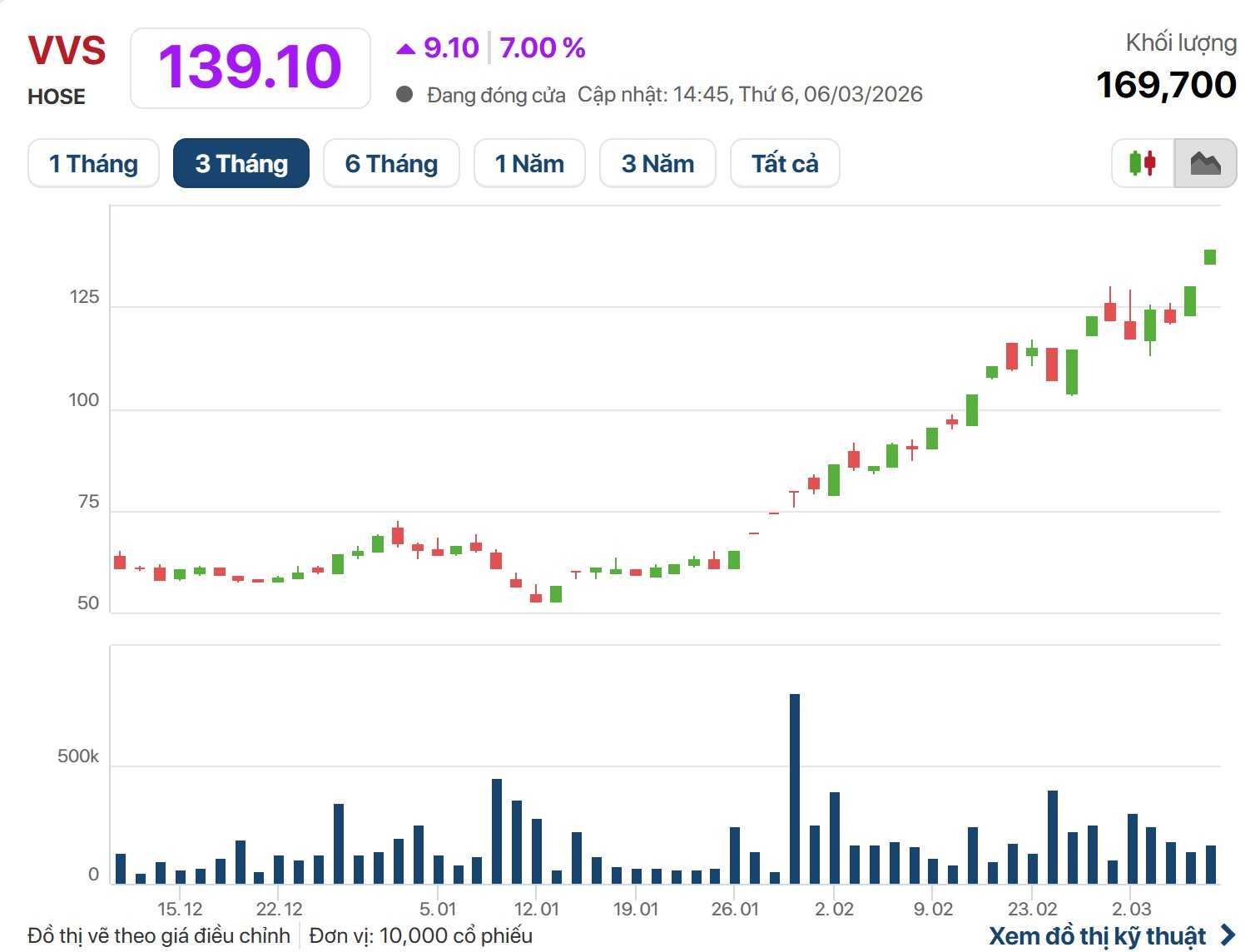 Nhờ duy trì xu hướng tăng giá từ đầu năm 2026, thị giá VVS đã tăng khoảng 114%, từ vùng 64.100 đồng/cổ phiếu lên gần 140.000 đồng/cổ phiếu. Đáng chú ý, đây vẫn là một “tân binh” trên sàn HoSE khi mới chính thức niêm yết từ ngày 10/12/2025. So với mức giá tham chiếu 58.000 đồng trong phiên giao dịch đầu tiên, thị giá hiện tại của cổ phiếu này đã tăng khoảng 2,4 lần.