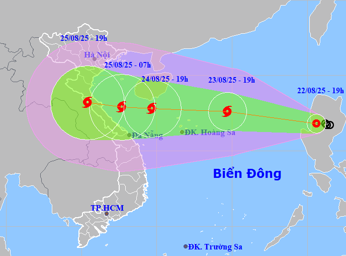 Dự báo ngay trong đêm nay (22/8), áp thấp nhiệt đới di chuyển vào Biển Đông, mạnh lên thành bão số 5 và di chuyển rất nhanh với vận tốc khoảng 20-25km/h.