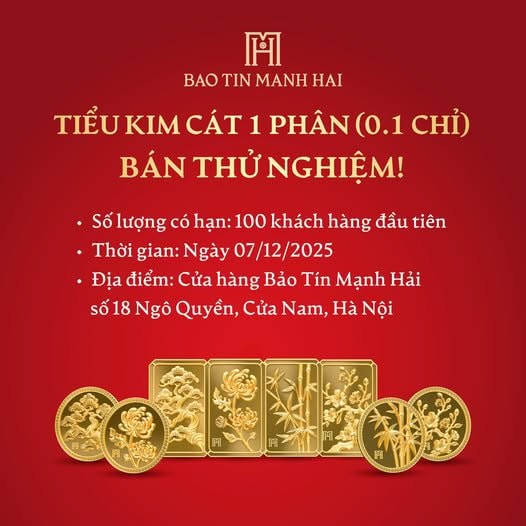 - Thời gian : Bắt đầu từ ngày 7/12/2025, Bảo Tín Mạnh Hải chính thức bán thử nghiệm sản phẩm Tiểu Kim Cát 1 phân (0,1 chỉ).