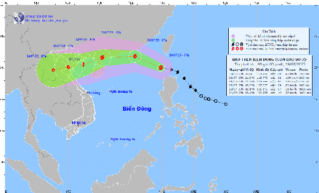 Theo Trung tâm khí tượng thủy văn quốc gia, vào lúc 07h ngày 19/7/2025, cơn bão WIPHA đã tiến vào vùng biển phía Đông Bắc khu vực Bắc Biển Đông, được xác định là cơn bão số 3 trong năm. Cơn bão gây chú ý với sức ảnh hưởng mạnh mẽ. Tâm bão được ghi nhận tại tọa độ 20,0°N – 119,8°E, với sức gió mạnh nhất đạt cấp 9 (tương đương 75–88km/h) và giật lên đến cấp 12. Bão di chuyển theo hướng Tây Bắc với tốc độ khoảng 20km/h, cho thấy khả năng ảnh hưởng đến các khu vực lân cận trong thời gian ngắn.