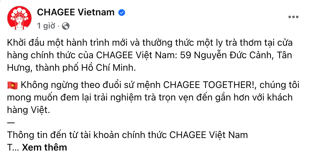 Vừa mới đây, cư dân mạng, đặc biệt là giới trẻ tại TP.HCM vô cùng bất ngờ và không ngửng ần rần khi thấy fanpage Chagee Vietnam hoạt động trở lại sau hơn 4 tháng "im hơi lặng tiếng". Trong bài đăng mới nhất, thương hiệu trà sữa này thông báo về "hành trình mới", đồng thời xác nhận sẽ chính thức khai trương cửa hàng đầu tiên tại địa chỉ 59 Nguyễn Đức Cảnh, Tân Hưng, TP.HCM.