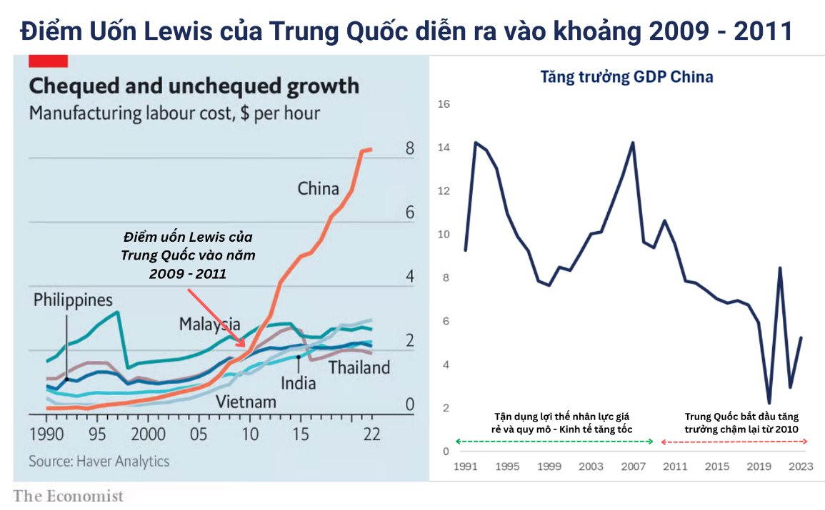 Vào khoảng cuối thập niên 2000 đến đầu thập niên 2010, nhiều nhà kinh tế bắt đầu nhận thấy Trung Quốc đang tiến gần hoặc đã đạt đến "Điểm chuyển đổi Lewis". Các biểu hiện của sự chuyển dịch này trở nên rõ rệt hơn, bao gồm việc tăng trưởng lương mạnh mẽ, khi chi phí lao động ở Trung Quốc tăng lên đáng kể, đặc biệt là tại các khu vực duyên hải và trong các ngành công nghiệp thâm dụng lao động, đi kèm với các cuộc đình công đòi tăng lương diễn ra thường xuyên hơn.