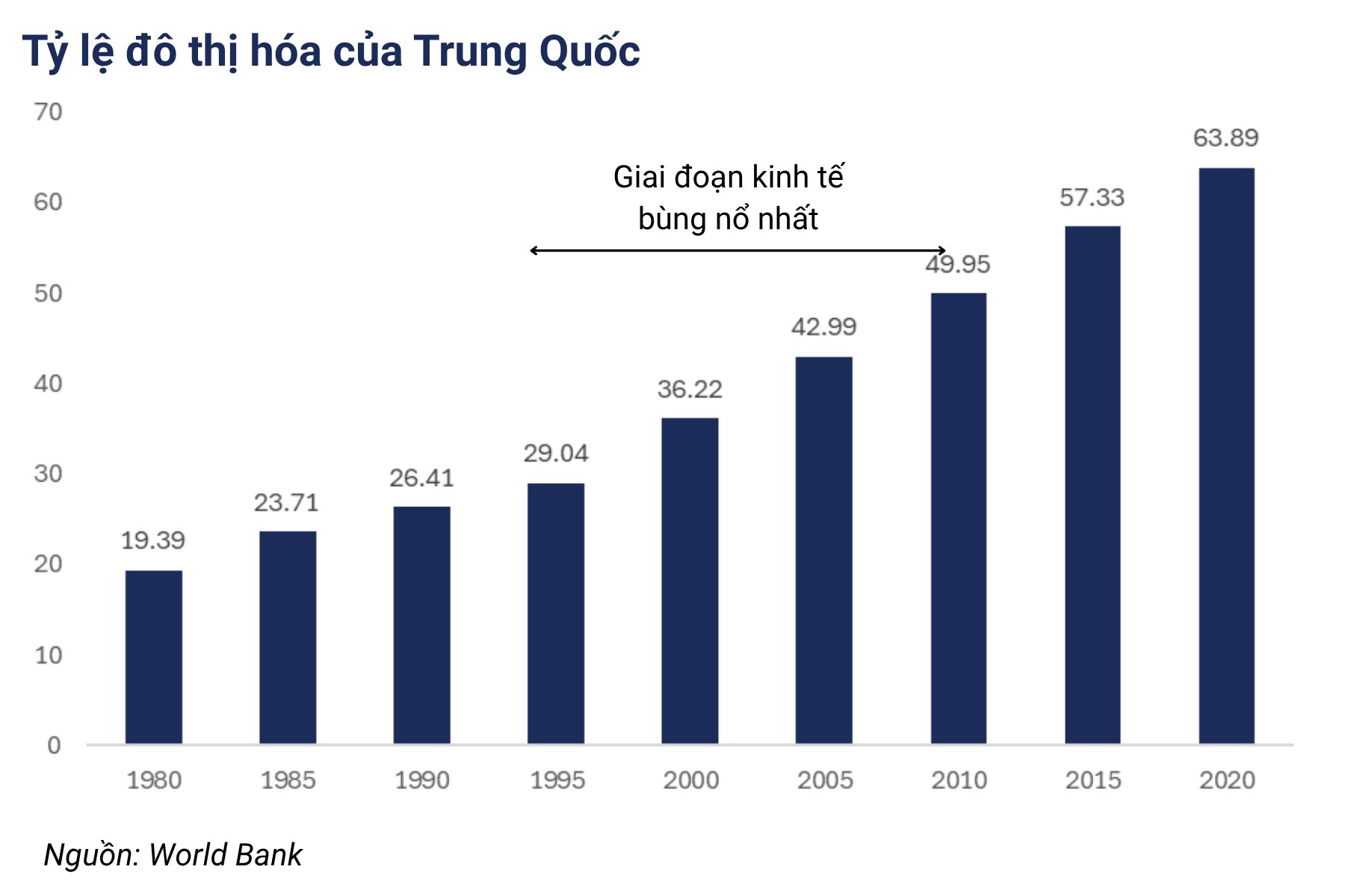 Wigroup đánh giâ, nếu nhìn vào tỷ lệ đô thị hóa, giai đoạn bùng nổ nhất của kinh tế Trung Quốc là từ 1995 đến 2010 kéo theo đó là tốc độ đô thị hóa tăng mạnh từ 29% vào 1995 lên 50% vào 2010 thì hiện tại tỷ lệ đô thị hóa của Việt Nam quanh mức 40%, hàm ý rằng, Việt Nam đang ở trong giai đoạn vàng cho phát triển kinh tế nhờ lực lượng lao động giá rẻ. Nhưng khoảng 5-10 năm nữa, Việt Nam sẽ chạm điểm uốn Lewis khi tỷ lệ đô thị hóa vượt quá 50% như Trung Quốc (2010).