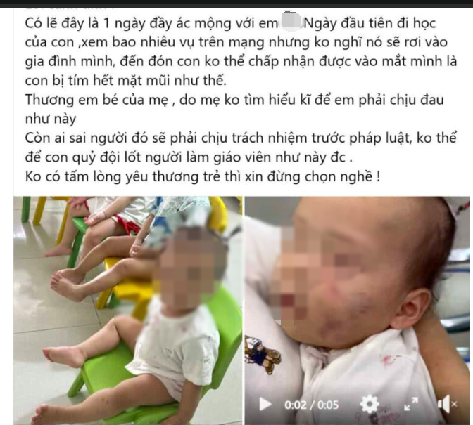 Được chia sẻ trên mạng xã hội, bài viết cùng những hình ảnh về bé gái với nhiều vết bầm tín trên mặt sau khi đi nhà trẻ về, đang là tâm điểm chú ý trong dư luận. Bé gái bị bầm tím mặt là D.T.V, được bố mẹ gửi tại cơ sở giáo dục mầm non tư thục Mùa Xuân - cơ sở 1 ở phường Tiền Phong (tỉnh Bắc Ninh). Trong những hình ảnh được chia sẻ, trên mặt bé xuất hiện các vết tím, trên má còn có dấu hiệu vết răng cắn.