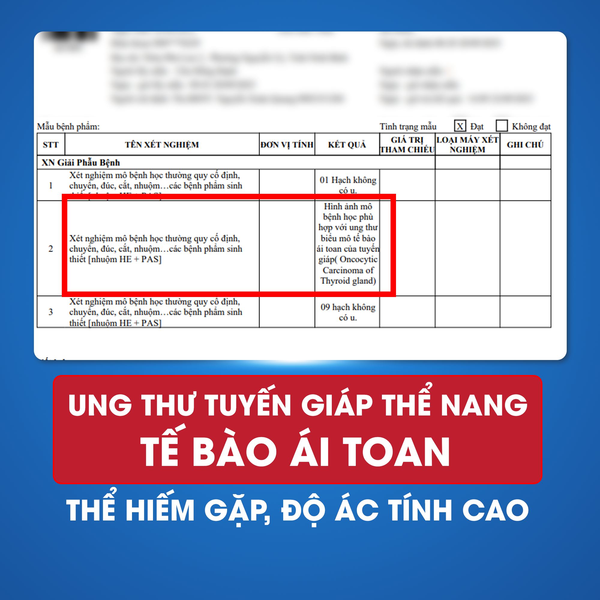 Kết quả giải phẫu bệnh xác nhận đây là ung thư tuyến giáp tế bào ái toan - một thể bệnh hiếm gặp, chỉ chiếm 3-5% trong các thể ung thư tuyến giáp và có độ ác tính cao hơn so với các thể ung thư tuyến giáp thông thường.