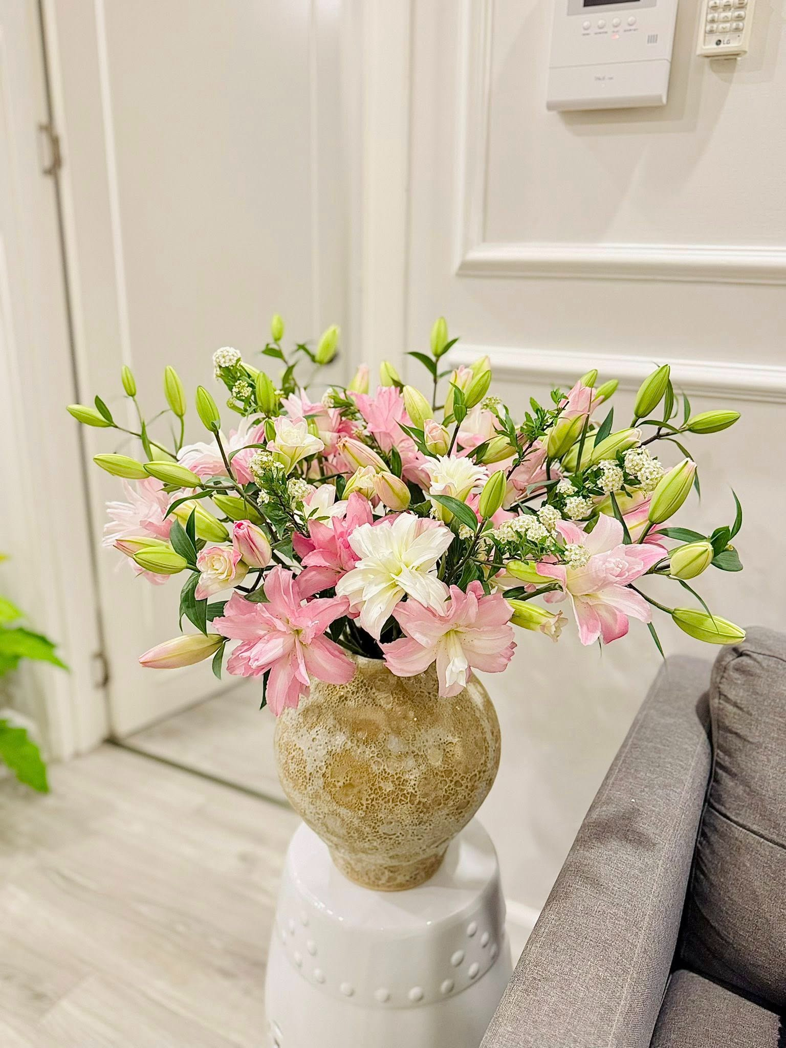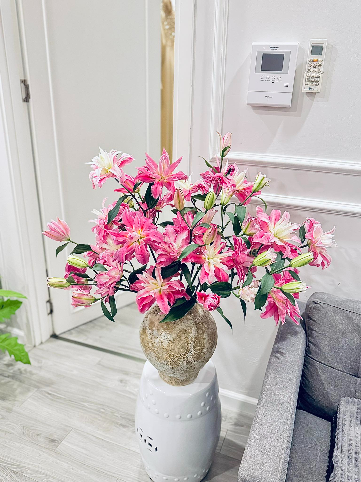 Trên tài khoản MXH của mình, Khánh Trang không chia sẻ nhiều về đời tư nhưng thường xuyên đăng tải những hình ảnh về không gian sống của mình. Tổng thể căn hộ được giữ ở phong cách tối giản với tông trắng xám làm chủ đạo, gọn gàng và ngăn nắp. Điều khiến không gian này không hề đơn điệu chính là sự xuất hiện của những bình hoa tươi.