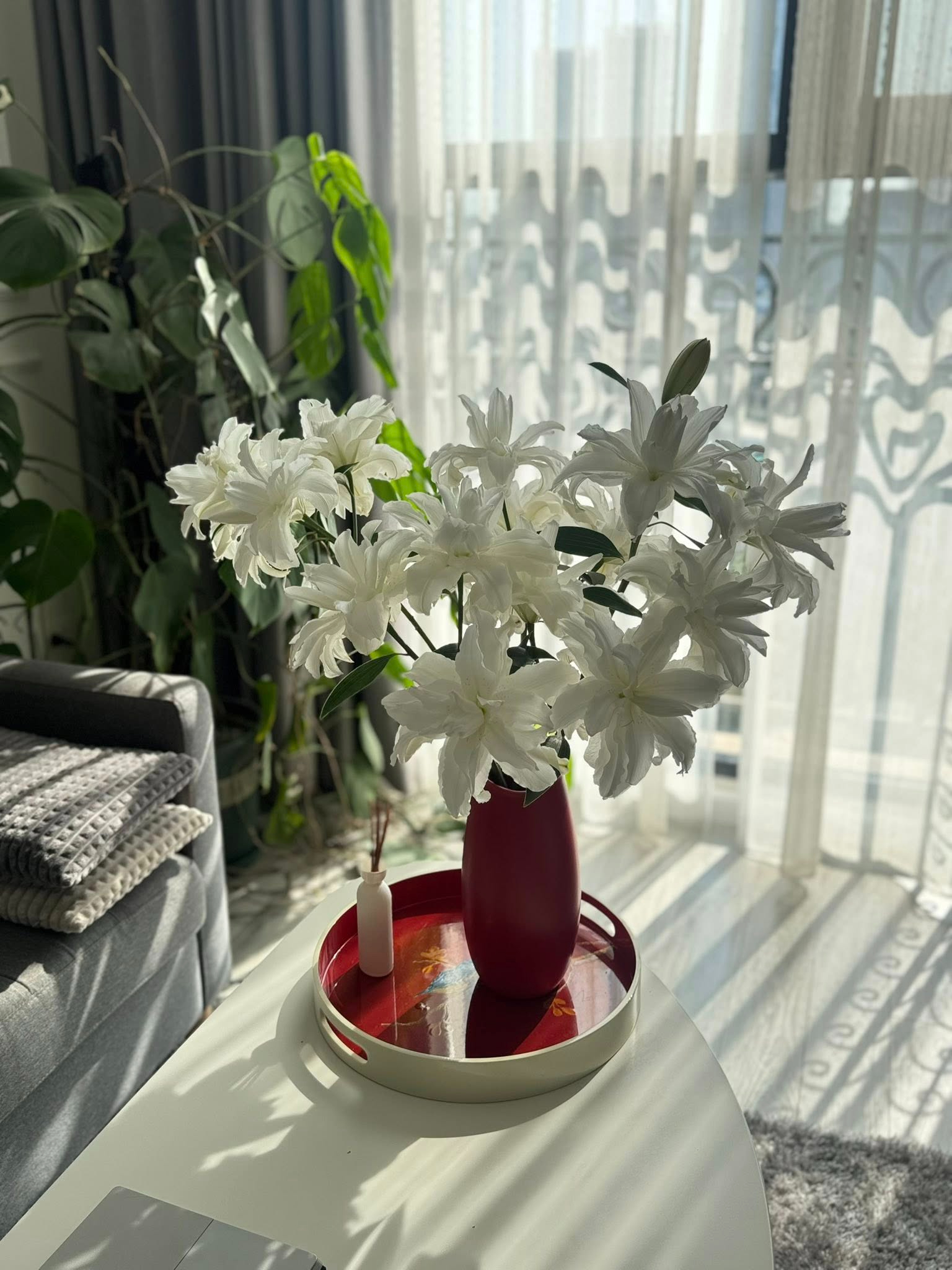 Trong số các loài hoa, Khánh Trang đặc biệt yêu thích hoa ly. Đây là loại hoa thường xuyên xuất hiện trong nhà cô. Những gam màu rực rỡ của các loại hoa nổi bật trên nền không gian trắng càng cho thấy sự tinh tế trong gu thẩm mỹ của nữ BTV.