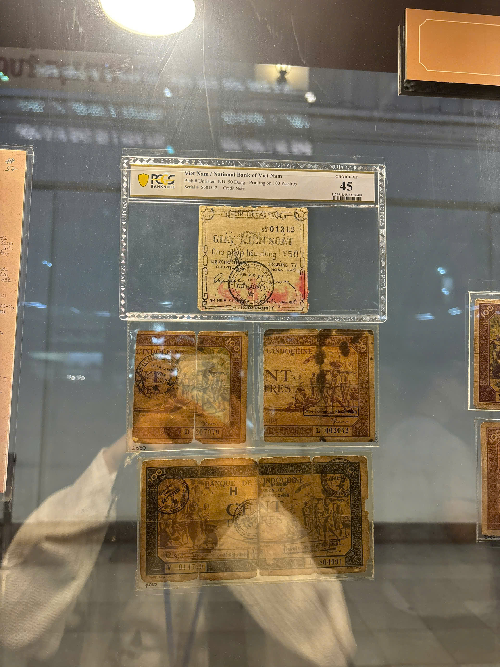 Một trong những điểm thu hút nhất của triển lãm chính là khu vực trưng bày tiền thật tiền giả của từng giai đoạn, đi kèm phụ lục “Bạc thật và đặc điểm bạc giả”. Người xem có thể quan sát từng chi tiết nhỏ, so sánh nét in và thấy được độ tinh vi đáng kinh ngạc của tiền giả lúc bấy giờ. Những bản phụ lục cũ kỹ nhưng còn nguyên giá trị khiến khách tham quan phải ghé sát kính, ngắm thật lâu để thấy được sự phức tạp của kỹ thuật in ấn.