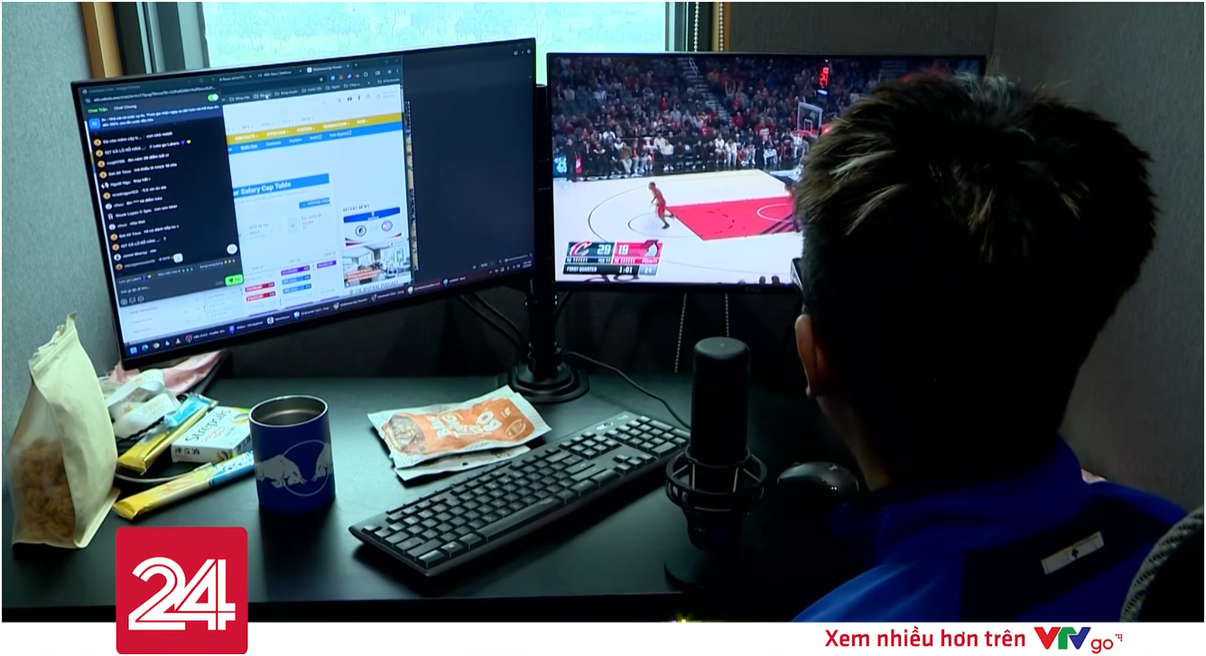 Hình ảnh bên trong cabin - hay còn được gọi là phòng thu của các BLV Xôi Lạc TV, clip do VTV24 ghi nhận. Ảnh chụp màn hình.
