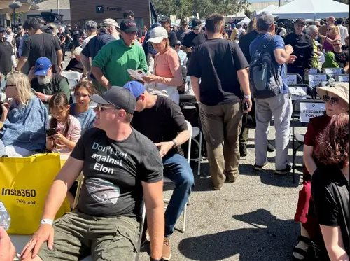 Anh Barr đến Trung tâm Sự kiện Hạt San Mateo lúc 1 giờ 30 chiều nhưng ngạc nhiên khi thấy bãi đỗ xe chỉ đầy một nửa. Ước tính có khoảng 1.000 người tham dự và nhiều khu vực vẫn còn trống. Phải chăng những lùm xùm về phát ngôn chính trị của Musk gần đây đã làm xói mòn lòng tin? Nhưng không, sự kiện có thể thiếu người, nhưng nhiệt huyết ở đây đậm đặc đến mức sạc được cả một đội xe điện.