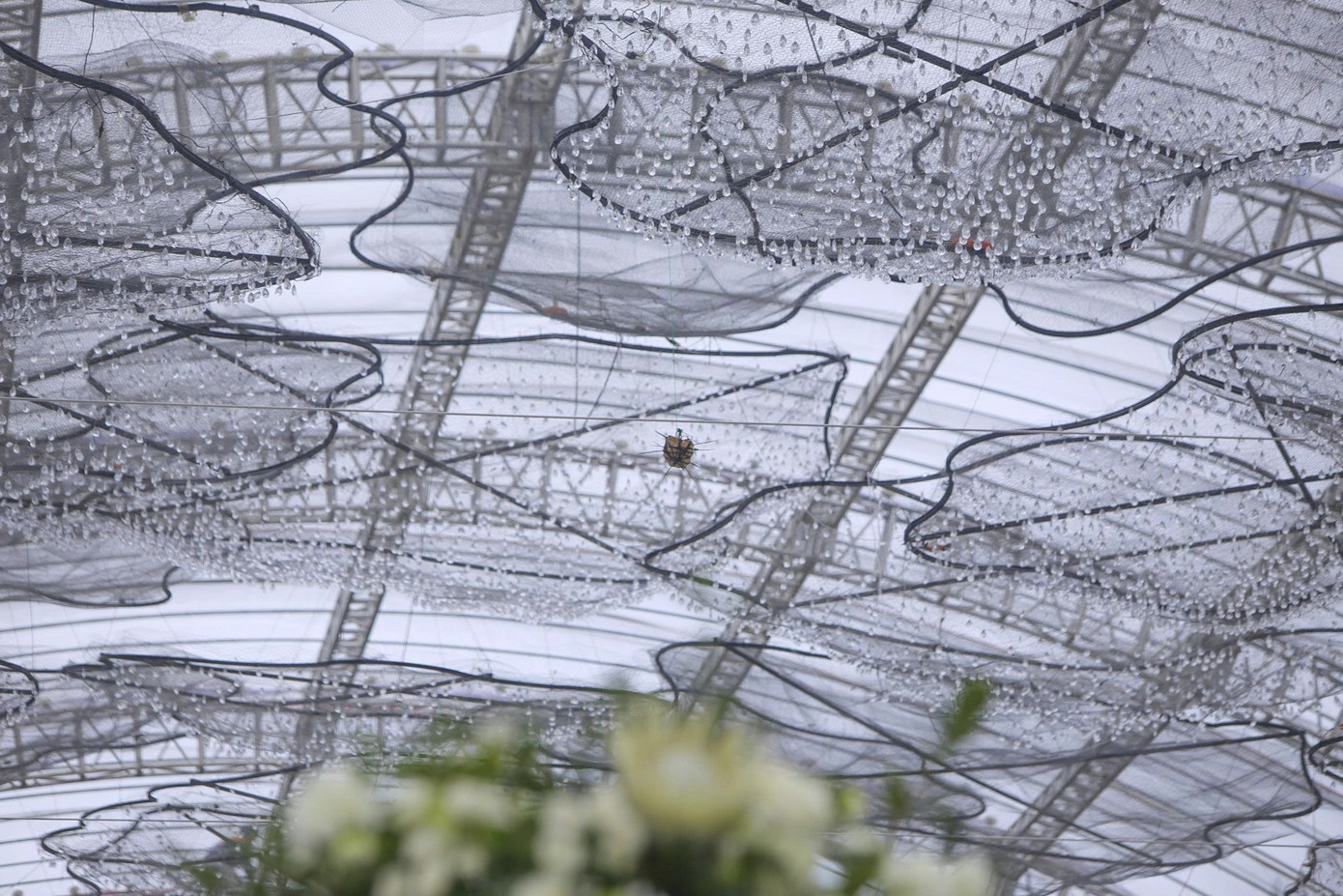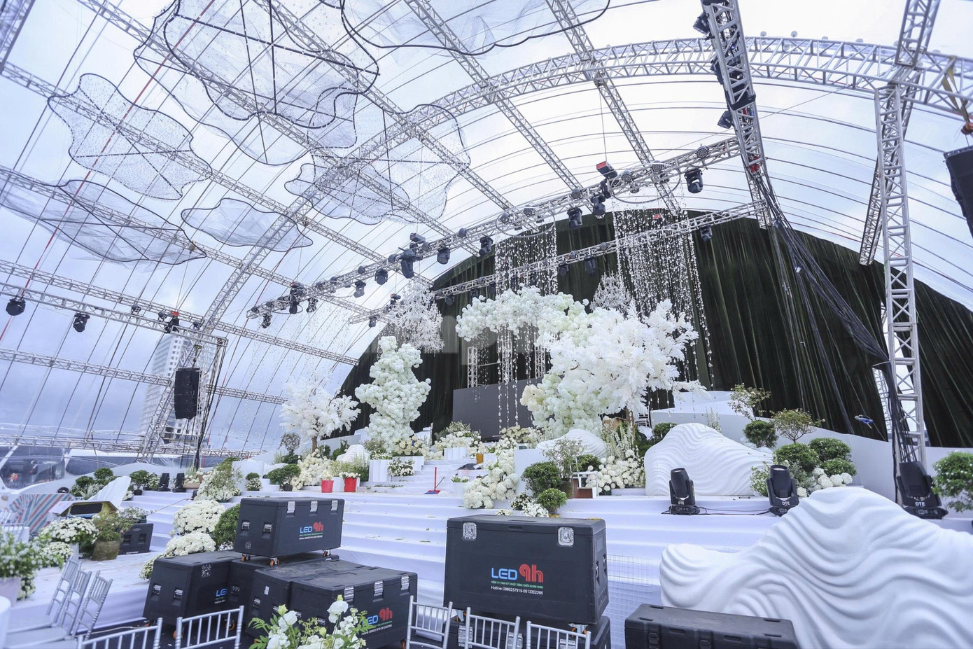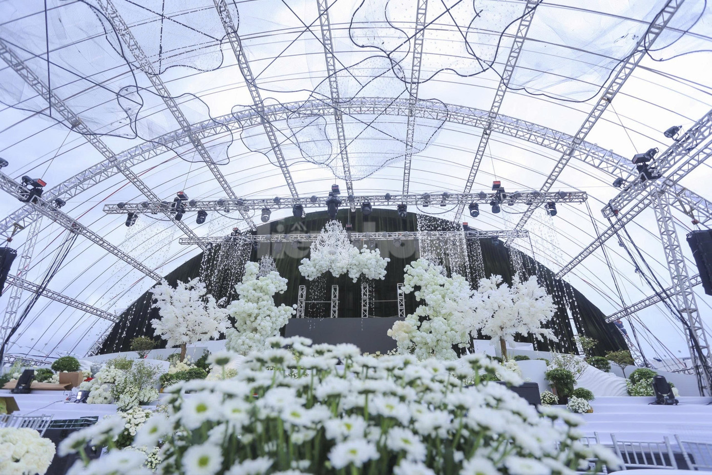 Cận cảnh hình ảnh rạp cưới mái vòm có diện tích hàng nghìn m2, sức chứa hàng nghìn người nhìn từ bên trong. Đơn vị tổ chức không chia sẻ cụ thể kinh phí.