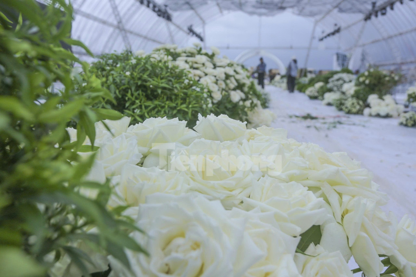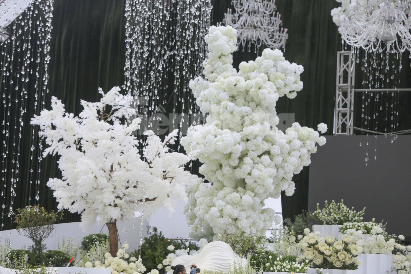 Chia sẻ với Tiền Phong, đơn vị thi công cho biết không gian lễ cưới lấy ý tưởng "khu vườn châu Âu" với hai tông màu trắng, xanh chủ đạo. Các loại hoa được trang trí tại tiệc cưới gồm hoa hồng, cúc, hoa ly, tu-líp, cẩm tú cầu, hoa lan...