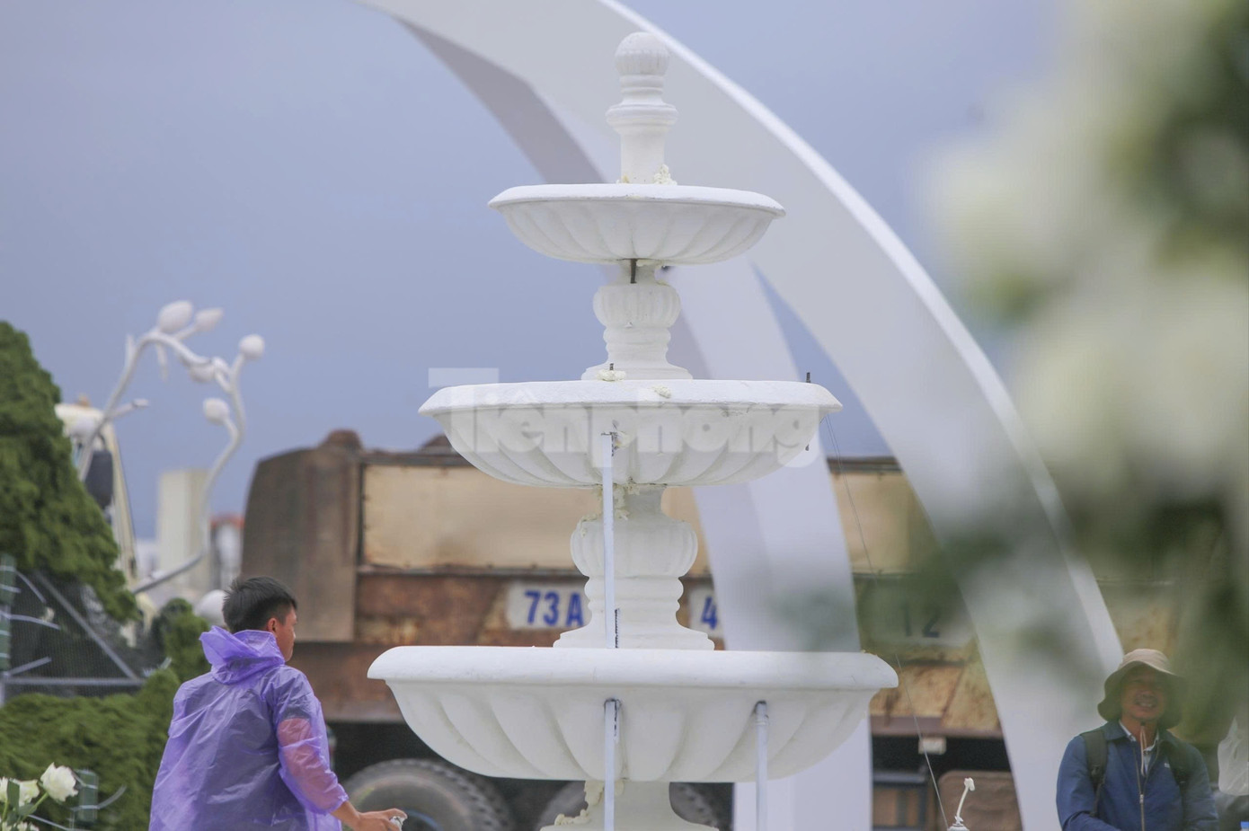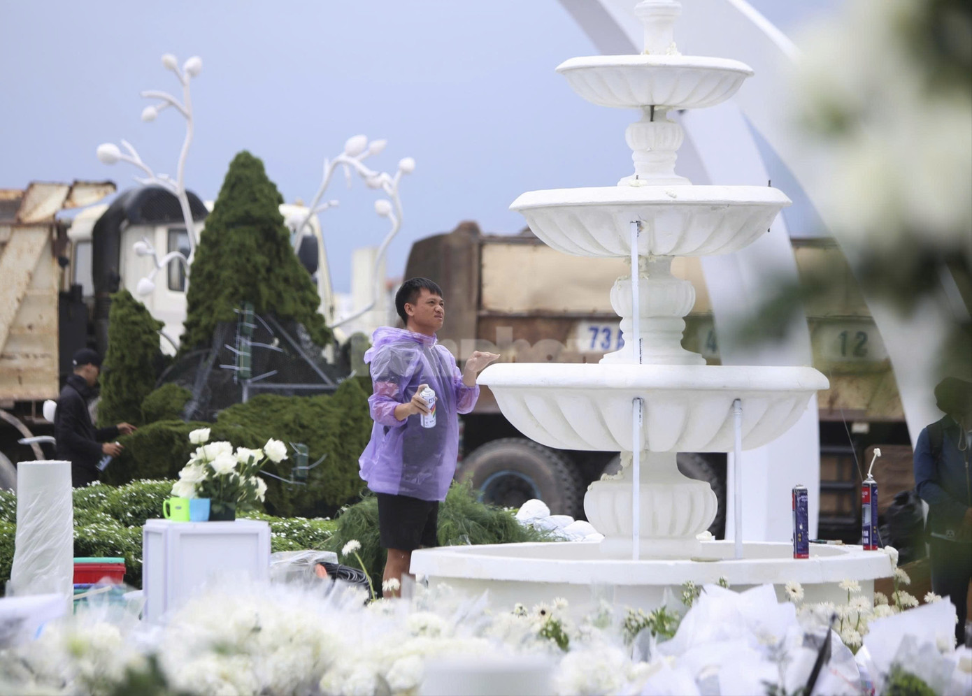 Tại khu đô thị Nam Cầu Dài tại Quảng Trị, đội ngũ thi công gấp rút hoàn thiện sân khấu, mái vòm và không gian tiệc cưới quy mô bên bờ sông Nhật Lệ. Lễ cưới của Đỗ Thị Hà và doanh nhân Viết Vương được thiết kế theo phong cách “khu vườn châu Âu”, hai tông màu trắng - xanh chủ đạo.