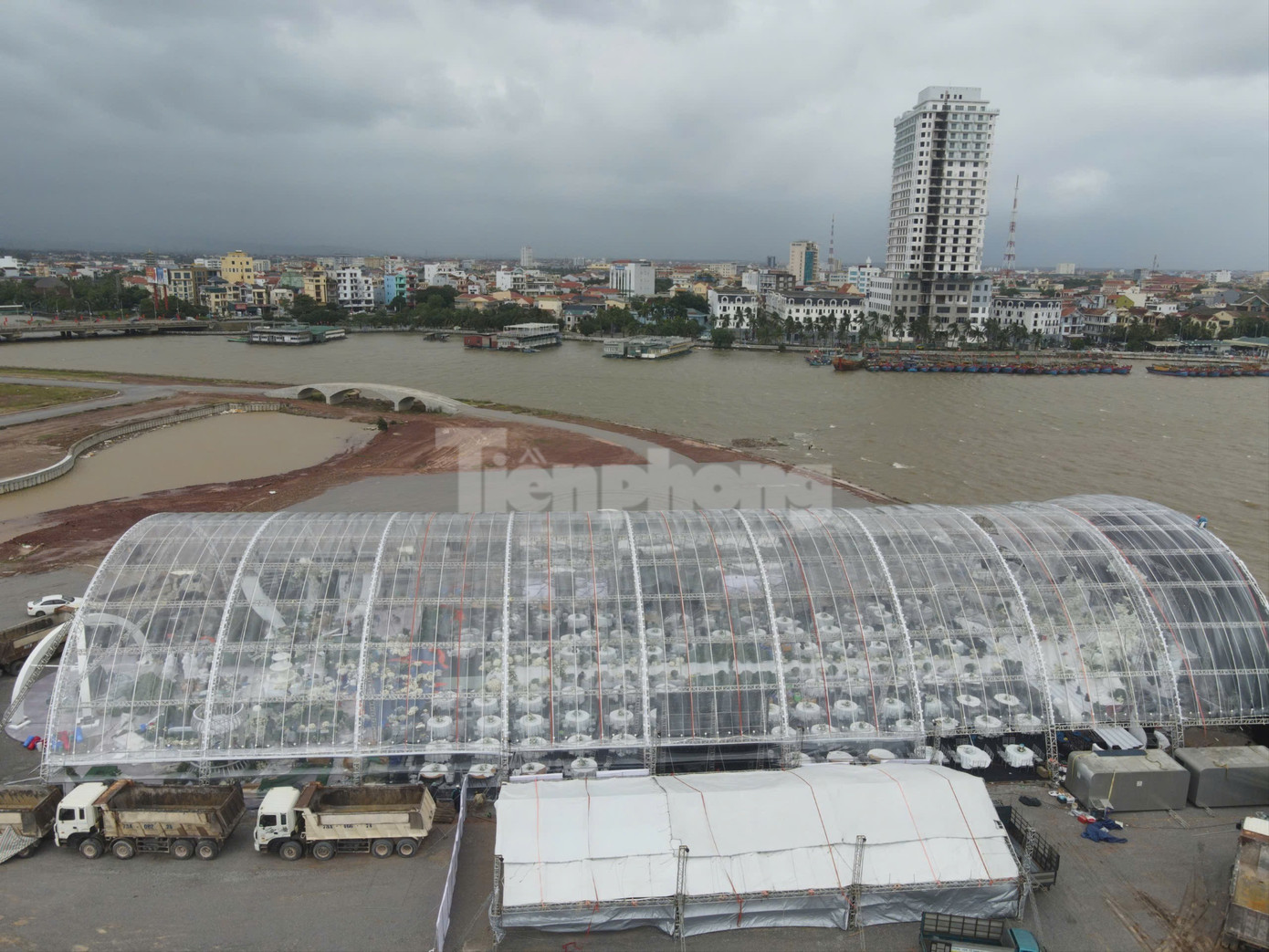 Phóng viên Tiền Phong ghi nhận sân khấu, rạp cưới mái vòm được dựng ngay gần cửa sông Nhật Lệ và đang có tình trạng gió thổi mạnh. Thời tiết hiện không mưa, nhưng ghi nhận có nhiều mây đen.